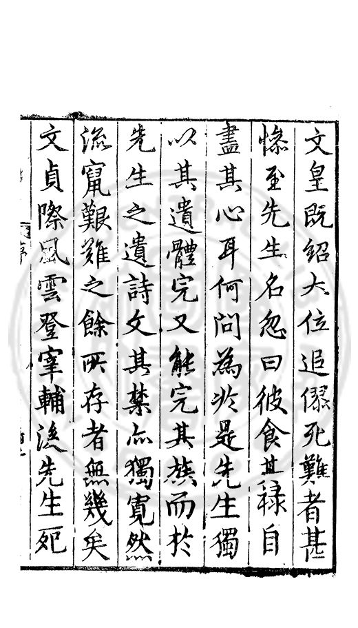 文皇既紹大位追僇死難者甚慘至先生名忽曰彼食其禄自盡其心耳何問為扵是先生獨以其遺體完又能完其族而扵先生之遺詩文其禁亦獨寛然流竄艱難之餘所存者無幾矣文貞際風雲登宰輔後先生死