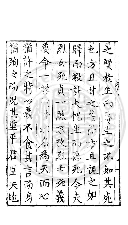 之賢扵生而辱生之不如其死也方且甘之若飴方且視之如歸而睱計夫恱生而惡死今夫烈女死貞一醮不改烈士死義委命一諾□□以名為天而心猶許之特以義不食其言而身猶殉之而况其重乎君臣天地