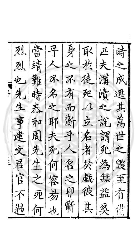 時之成逃其萬世之毁至有借匹夫溝瀆之說謂死為無益奚取扵徒死以立名者於戯彼其身之不有而蘄乎人名之耶蘄乎人不名之耶夫死何容易也當靖難時泰和周先生之死何烈烈也先生事建文君官不過