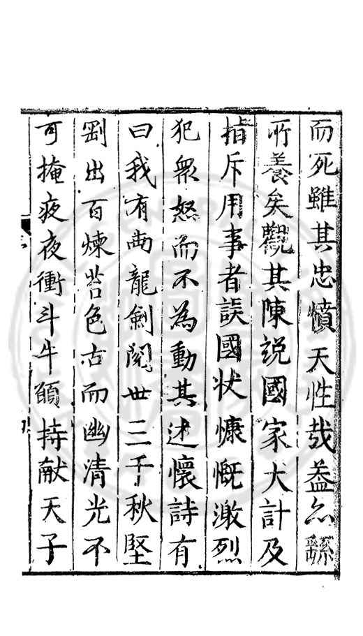 而死雖其終憤天性哉葢亦繇所養矣觀其陳說國家大計及指斥用事者誤國状慷慨激烈犯眾怒而不為動其述懐詩有曰我有兩龍劍閱世三千秋堅剛出百煉苔色古而幽清光不可掩夜夜衝斗牛願持献天子