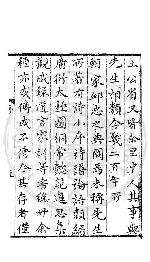 土工省又皆余里中人其事與先生相類今幾二百年所朝家卹忠之典闕焉未稱先生所著有詩小序詩譜論語類編廣衍太極圖綱常懿範進思集觀感録邇言家訓等書縂卄余種亦或傳或不傳今其存者僅