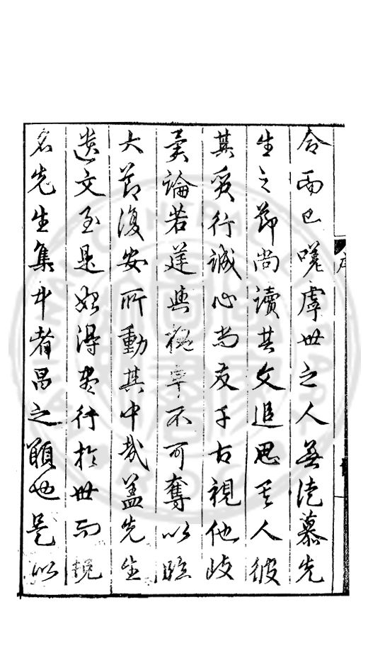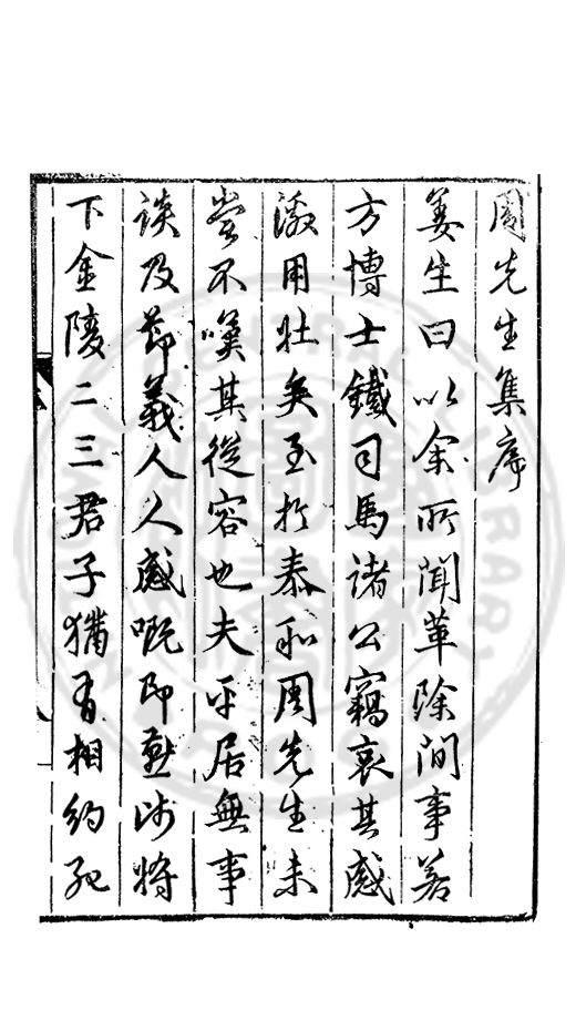先生之文不能當文貞夥而亦自斐然即詩可以例巳余膚立人也烏能序先生集聊囙令之請而抒其願為執鞭者而已