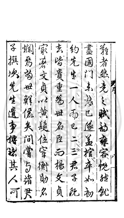 難者然竟之賦□雍容忱然就盡國門未□巳遂盖棺卒如初約先生一人而巳二三君子既去皆貴重為世名臣而楊文貞冣著文貞以黄髮位宰衡勛名爛焉當世鮮偌矣間甞与諸君子撰次先生遺事傳諸其人可
