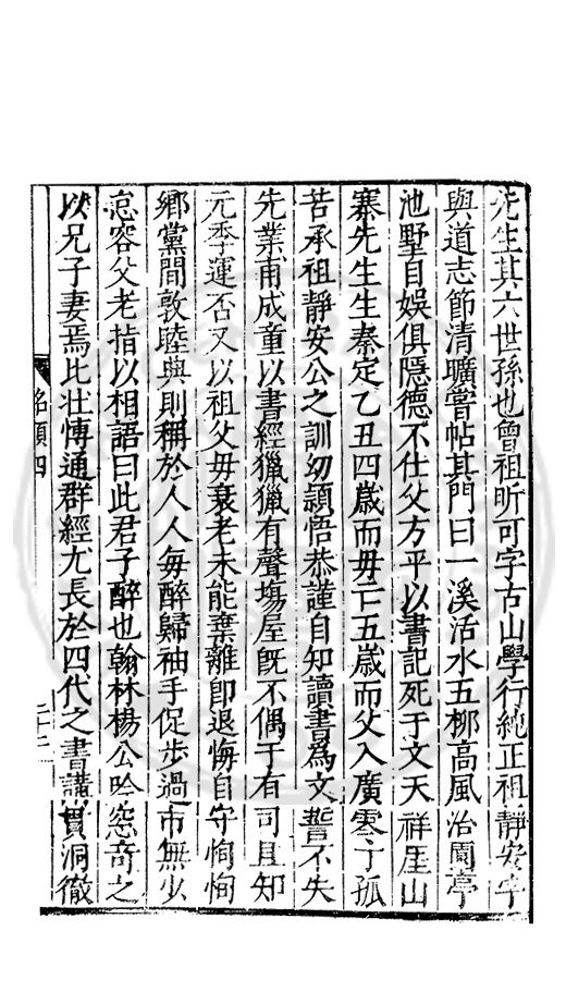 父月溪大父于徳父邦賢皆不仕先生少孤貧喜學力於孝悌忠信其胸次坦夷明白事非義不為遇人無少長賤貴皆有恩意然於是非白黒無所混初受業於里儒胡渚樵渚樵愛之以孫女女焉又從國子學錄蕭先生執授詩經學成舉教官授霍邱訓導太祖高皇帝竒其貌問常所業對曰教鄉人子弟讀書為善遂停訓導擢為周王府奉祠正尋陞紀善王聞其好著書使歸取以進予時始識先生清脩玉立温然君子也