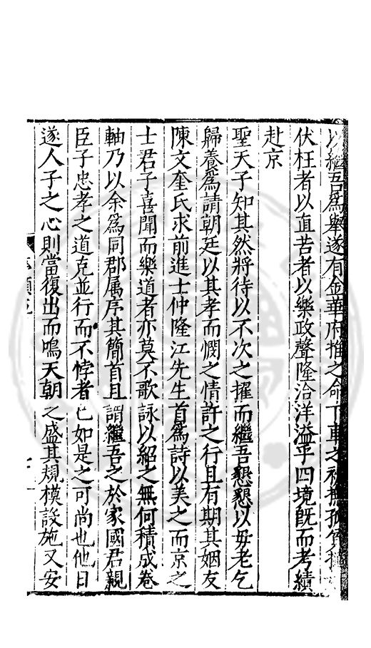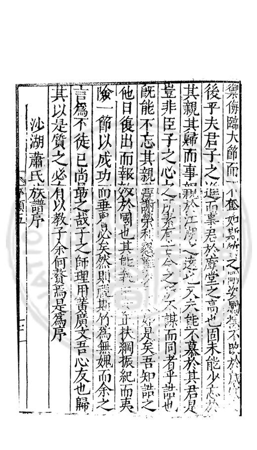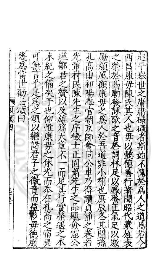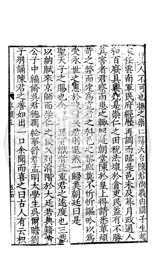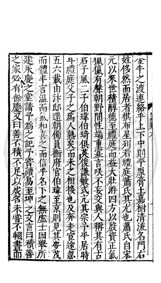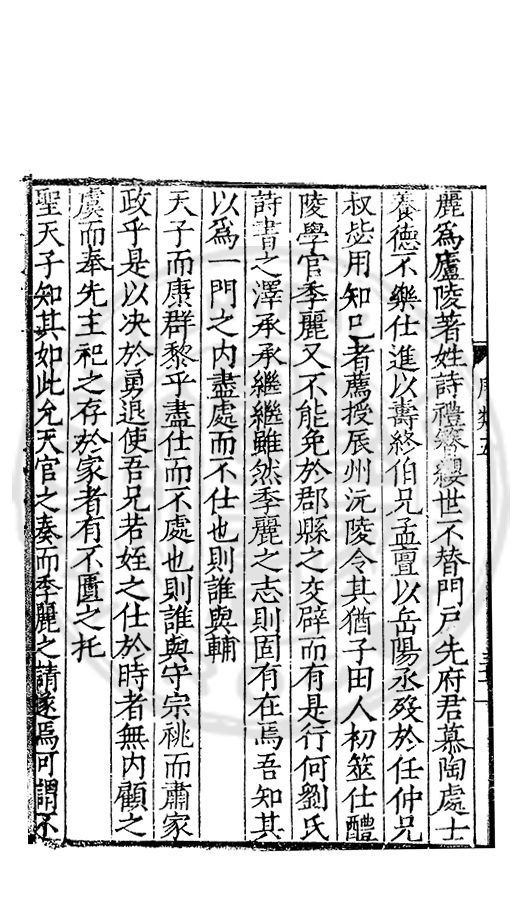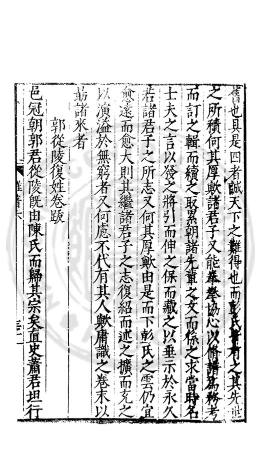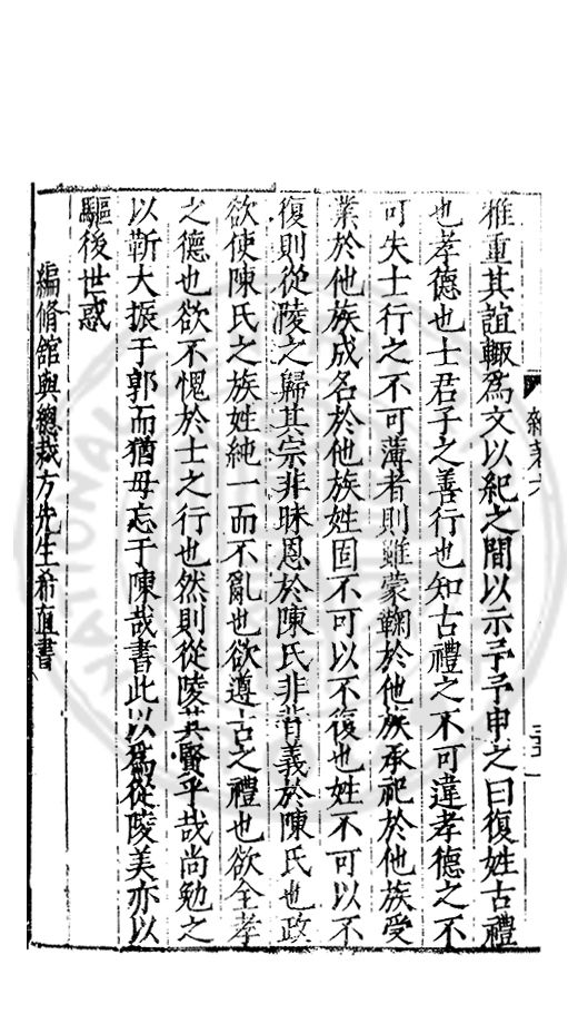 雅重其誼輙爲文以紀之間以示予予申之曰復姓古禮也孝德也士君子之善行也知古禮之不可違孝德之不可失士行之不可薄者則雖蒙鞠於他族承祀於他族受業於他族成名於他族姓固不可以不復也姓不可以不復則從□之歸其宗非昧恩於陳氏非背義於陳氏也政欲使陳氏之族姓純一而不亂也欲遵古之禮也欲全孝之德也欲不愧於士之行也然則從陵其賢乎哉尚勉之以靳大振于郭而猶毋忘于陳哉書此以爲從陵美亦以驅後世惑