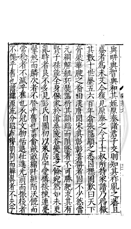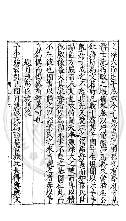舊也具是四者誠天下之難得也而彭氏皆有之其先世之所積何其厚歟諸君子又能拳拳協心以脩譜爲務考而訂之輯而續之取累朝諸先輩之文而係之求當時名士夫之言以發之將引而伸之保而藏之以垂示於永久若諸君子之所志又何其厚歟由是而下彭氏之雲仍宜愈逺而愈大則其繼諸君子之志復紹而述之擴而充之以演溢於無窮者又何慮不代有其人歟庸識之卷末以朂諸來者