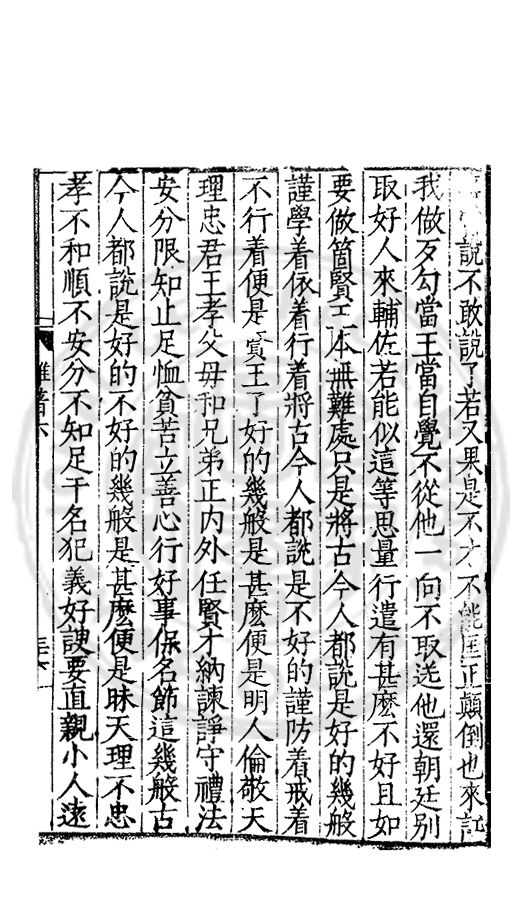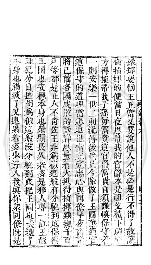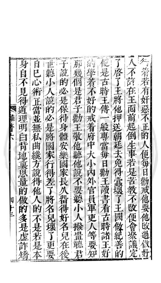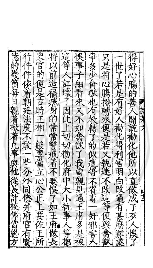 得好心膓的善人開説勸化他所以直做成了歹人悞了一世了若是有好人勸化得利害明白改過有甚麽難處只是将心膓撥轉來便是若又執迷不改這等便與禽獸爭多少禽獸也有教轉了的似這等不省專一奸邪害人悞事子細看來又不如禽獸了我曽親見過王府多是被這等人訌壞了因此上切切勸化府中大小執事人等都将以前造禍滅身的常常警戒着不要悞了如王府做長史官的便是古時王相一般專當立心公正上要佐王所行件件依着朝廷法度不敢一些分外同僚并府官有賢徳的幾箇每日親着敬着凢事與他從長計校停當纔方