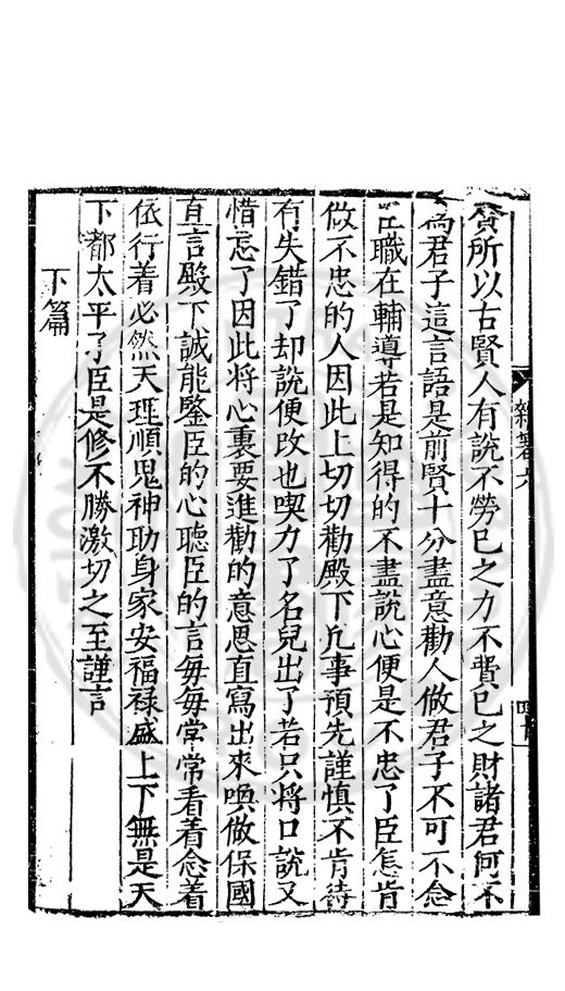 賛所以古賢人有説不勞己之力不費己之財諸君何不爲君子這言語是前賢十分盡意勸人做君子不可不念臣職在輔導若是知得的不盡説心便是不忠了臣怎肯做不忠的人因此上切切勸殿下凢事預先謹慎不肯待有失錯了却説便改也喫力了名兒出了若只将口説又惜忘了因此将心裏要進勸的意思直寫出來喚作保國直言殿下誠能鍳臣的心聴臣的言每每常常看着念着依行着必然天理順鬼神助身家安福禄盛上下無是天下都太平了臣是修不勝激切之至謹言