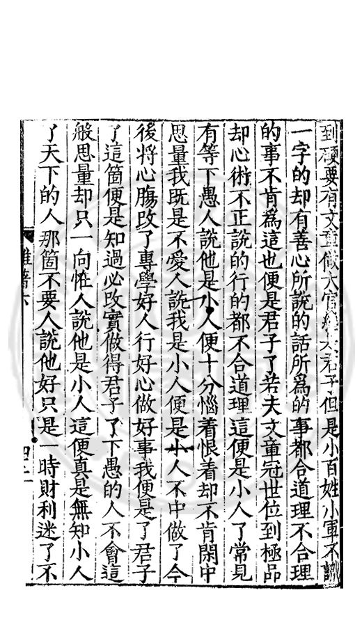 到硬要有文章做大官纔是君子但是小百姓小軍不識一字的却有善心所説的話所爲的事都合道理不合理的事不肯爲這也便是君子了若夫文章冠世位到極品却心術不正説的行的都不合道理這便是小人了常見有等下愚人説他是小人便十分惱着恨着却不肯閑中思量我既是不愛人説我是小人便是小人不中做了今後将心膓改了專學好人行好心做好事我便是了君子了這箇便是知過必改實做得君子了下愚的人不會這般思量却只一向恠人説他是小人這便真是無知小人了天下的人那箇不要人説他好只是一時財利迷了不