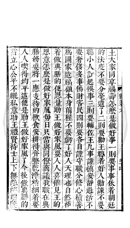 好着也大家得安樂但有這四般的小人併力去了不要説這是王信愛的人不敢説他又説不干我事一日容一日一人推一人不肯省悟那裏有不悞了事的至勸至勸凢王府官不問文武大小職分但在一府便是利害相關怎麽使得不同心不協力共成王事官大的不要倚恃我大便生傲慢在小的心在小的不要倚恃我有見識强如他便生輕慢在大的心這箇便生支節了自家相處不得快活怎麽濟得國事了爲此切勸各官在大的只合不将官品論着傾心至誠禮待所属賢能的更相勸戒在小的只合推至公的心同僚有不是處有不知處從長小心勸