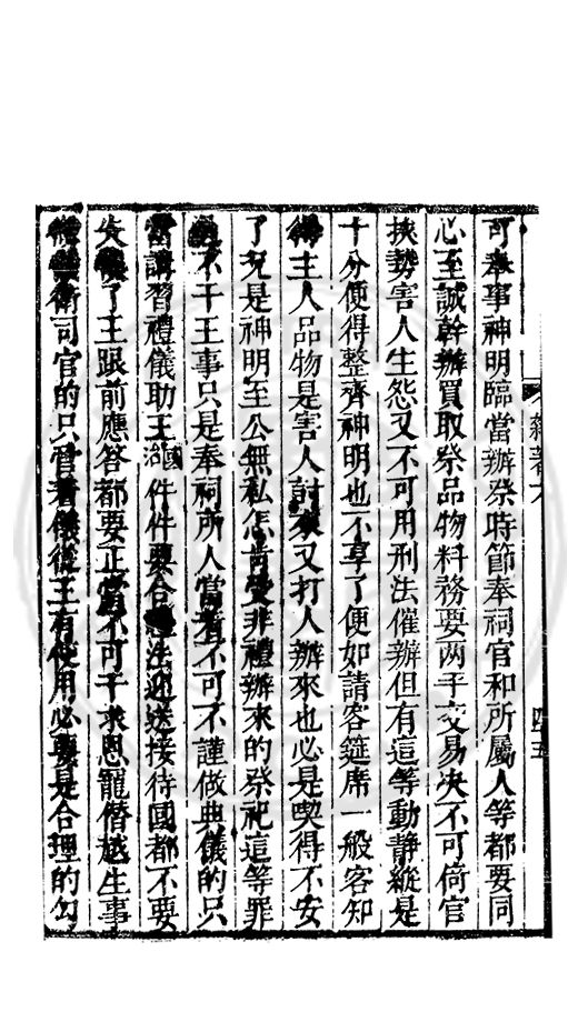 可奉事神明臨當辦祭時節奉祠官和所屬人等都要同心至誠幹辦買取祭品物料務要兩手交易决不可倚官挾勢害人生怨又不可用刑法催辦但有這等動静縱是十分便得整齊神明也不享了便如請客筵席一般客知得主人品物是害人討來又打人辦來也必是喫得不安了况是神明至公無私怎肯受非禮辦來的祭祀這等罪□不干王事只是奉祠所人當着不可不謹做典儀的只當講習禮儀助王國治件件要合□法迎送接待國都不要失□了王跟前應答都要正當不可干求恩寵僣越生事□□衛司官的只管着儀從王有使用必要是合理的勾