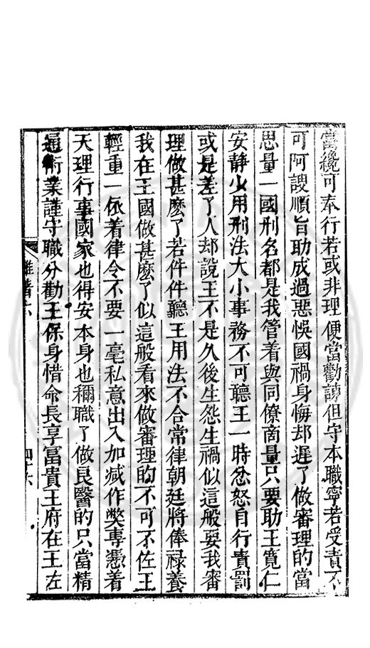 當纔可奉行若或非理便當勸諫但守本職寜若受責不可阿諛順旨助成過惡悞國禍身悔却遲了做審理的當思量一國刑名都是我管着與同僚商量只要助王寛仁安静少用刑法大小事務不可聴王一時忿怒自行責罰或是差了人却説王不是久後生怨生禍似這般要我審理做甚麽了若件件聽王用法不合常律朝廷將俸禄養我在王國做甚麽了似這般看來做審理的不可不佐王輕重一依着律令不要一毫私意出入加減作弊專慿着天理行事國家也得安本身也穪職了做良醫的只當精通術業謹守職分勸王保身惜命長享冨貴王府在王左