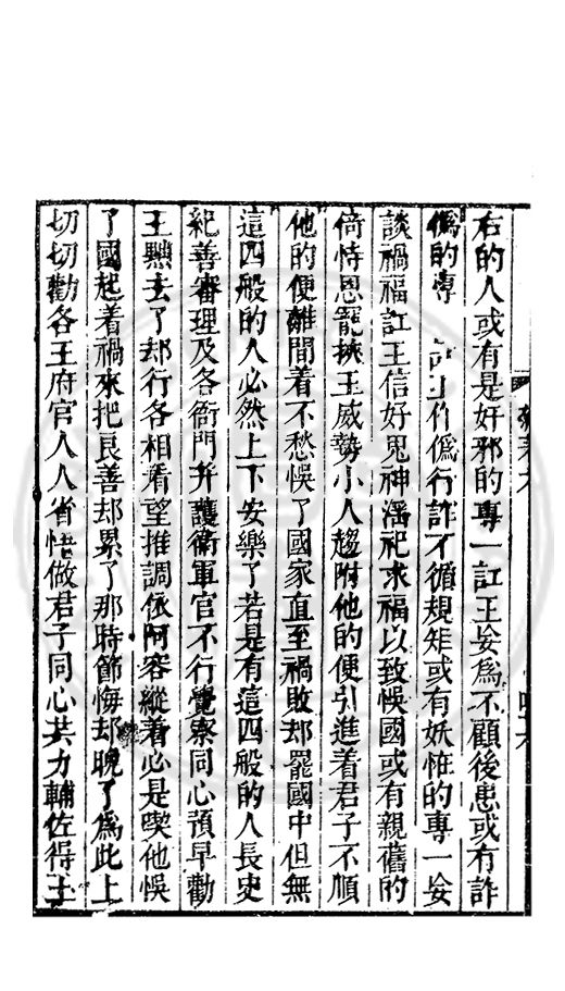 右的人或有是奸邪的專一訌王妄爲不顧後患或有詐僞的專□□王作僞行詐不循規矩或有妖恠的專一妄談禍福訌王信好鬼神滛祀求福以致悞國或有親舊的倚恃恩寵挾王威勢小人趨附他的便引進着君子不順他的便離間着不愁悞了國家直至禍敗却罷國中但無這四般的人必然上下安樂了若是有這四般的人長史紀善審理及各衙門并護衞軍官不行覺察同心預早勸王黜去了却行各相看望推調依阿容縱着必是喫他悞了國起着禍來把良善却累了那時節悔却晚了爲此上切切勸各王府官人人省悟做君子同心共力輔佐得王
