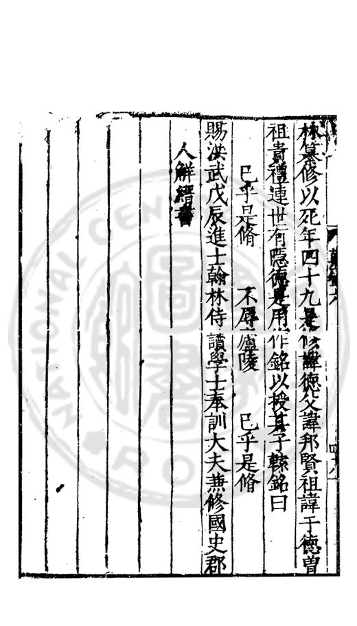 林纂修以死年四十九是脩諱徳父諱邦賢祖諱于徳曽祖貴禮連世有隱徳是用作銘以授其子轅銘曰