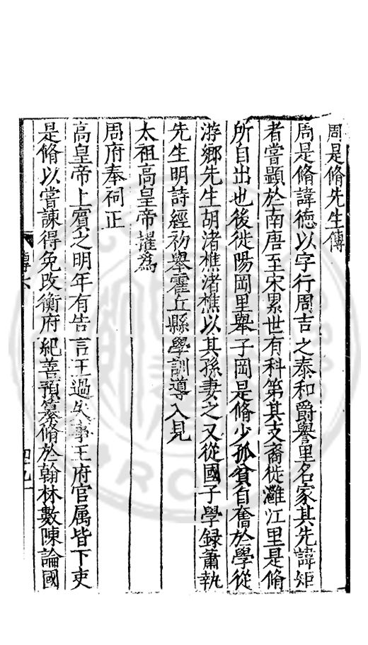 周是脩諱徳以字行周吉之泰和爵譽里名家其先諱矩者嘗顕於南唐至宋累世有科第其支裔徙灉江里是脩所自出也後徙陽岡里舉子岡是脩少孤貧自奮於學從游鄉先生胡渚樵渚樵以其孫妻之又從國子學録蕭執先生明詩經初舉霍丘縣學訓導入見太祖高皇帝擢爲周府奉祠正高皇帝上賔之明年有告言王過失事王府官属皆下吏是脩以嘗諫得免改衡府紀善預纂脩於翰林數陳論國