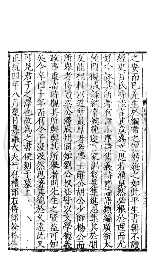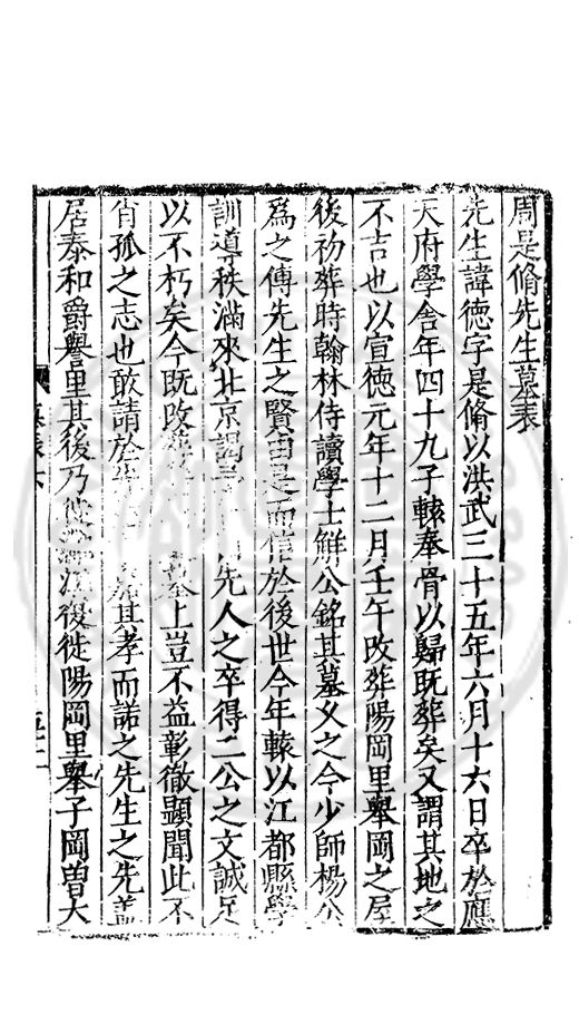 先生諱徳字是脩以洪武三十五年六月十六日卒於應天府學舎年四十九子轅奉骨以歸既葬矣又謂其地之不吉也以宣徳元年十二月壬午改葬陽岡里舉岡之屋後初葬時翰林侍讀學士觧公銘其墓乆之今少師楊公為之傳先生之賢由是而信於後世今年轅以江都縣學訓導秩滿來北京謁予□□先人之卒得二公之文誠足以不朽矣今既改□□□□墓上豈不益彰徹顕聞此不肖孤之志也敢請於先□□嘉其孝而諾之先生之先盖居泰和爵譽里其後乃徙灉江復徙陽岡里舉子岡曾大