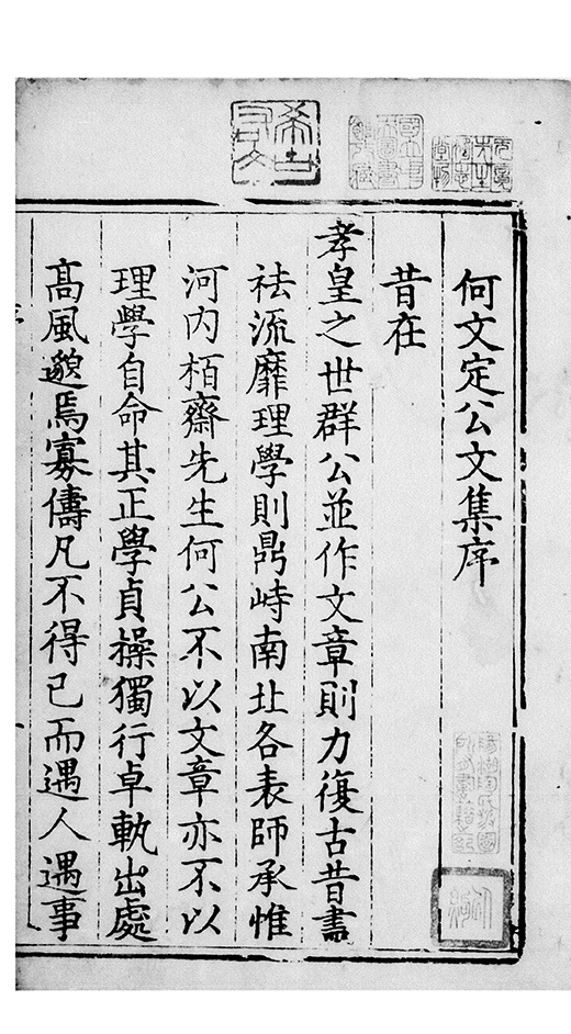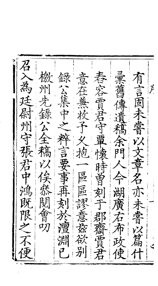 有言固為□以文章名亦未□以篇什彚舊傳遺稿余門人今湖廣右布政使舂容賈君守覃懷時曾刻于郡齋賈君意在蕪收予久抱一區區謬意茲欲別錄公集中之粹言要事別再刻於澶淵已檄州先錄公全稿以俟參閱會叨