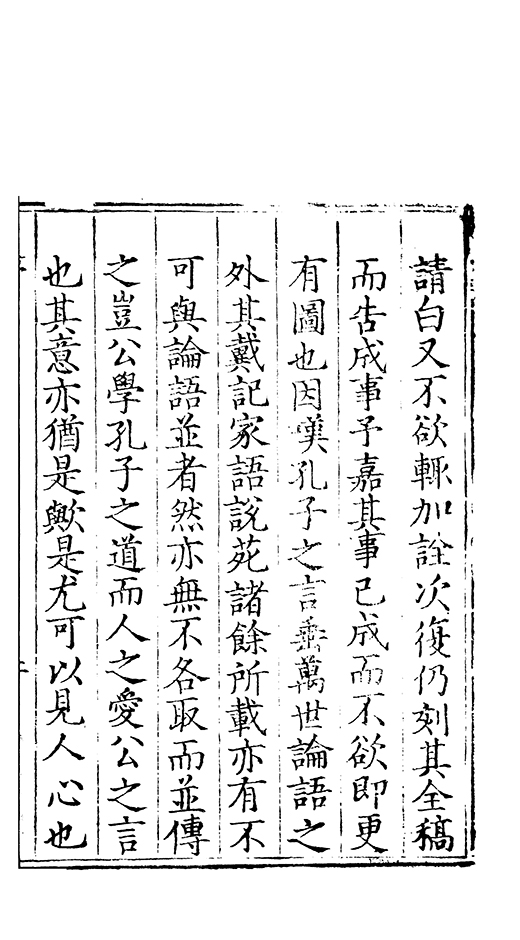 請白又不欲諏加詮次復仍刻其全稿而告成事予嘉其事已成而不欲即更有圖也因嘆孔子之言垂萬事論語之外戴其家語說苑諸餘所載者亦有不可與論語並者然亦無不各取而並傳之豈公學孔子之道而人之愛公之言也其意亦猶是歟是尤可以見人心也