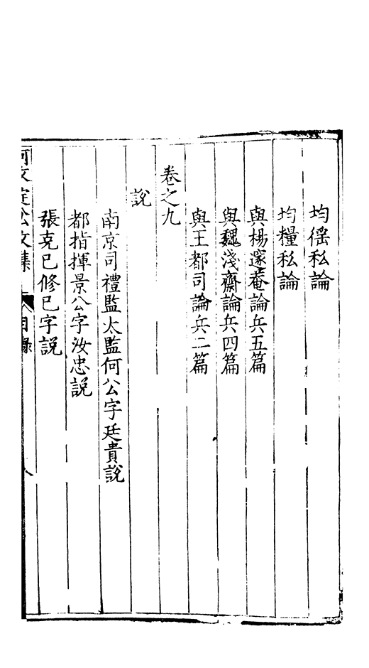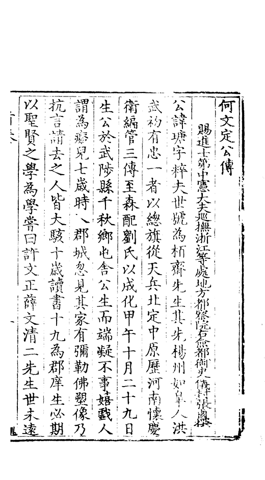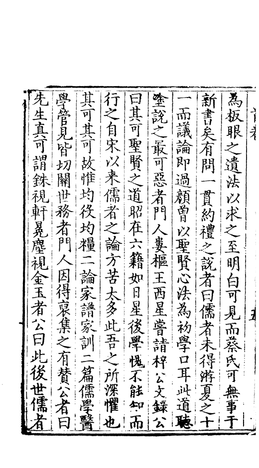 為板眼之遺法以求之至明白可見而蔡氏可無事于新書矣有問一貫約禮之 者曰儒者未得游夏之十一而議論即過顏□以聖賢心法為□學口耳 道聽塗 之最可惡者門人婁樞王西星 請梓公文錄公曰其可聖賢之道昭在六籍如日星後學愧不能知而行之自宋以来儒者之論方苦太多此吾知所深懼也其可其可故惟均□均糧二論家譜家訓二篇儒學醫學管見皆切關世務者門人因得裒集之有賛公者曰先生真可謂銖視軒冕塵視金玉者公曰此後世儒者