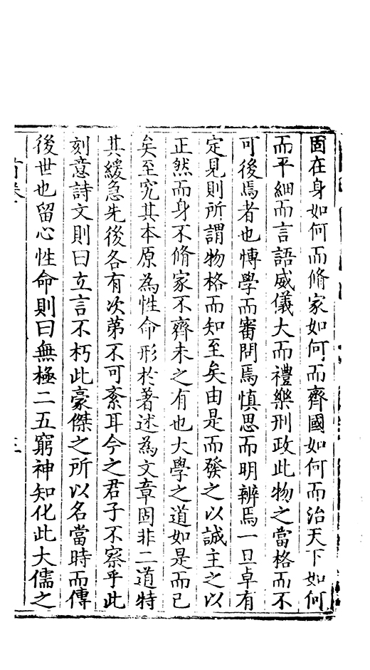 固在身如何而脩家如何而齊國如何而治天下如何而平細而言語威儀大而禮樂刑政此物之當格而不可後焉者也愽學而審問焉慎思而明辨焉一旦卓有定見則所謂格物而知至矣由是而發之以城主之以正然而身不脩家不齊未之有也大學之道如是而已矣至究其本原為性命形於著述為文章固非二道特其緩急先後各有次第不可紊耳今之君子不察乎此刻意詩文則曰立言不朽此豪傑之所以名當時而傳後世也留心性命則曰無極二五窮神之化此大儒之