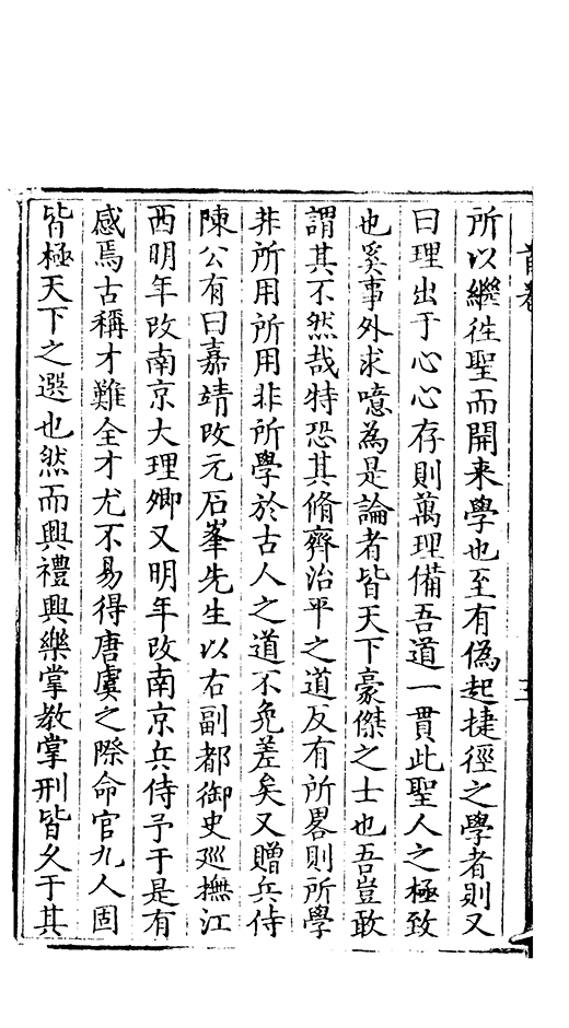 所以繼徃聖而開来學也至有偽起捷徑之學者則又曰理出於心心存則萬理備吾道一貫此聖人之極致也奚事外求噫為是論者皆天下豪傑之士也吾豈敢謂其不然哉特恐其脩齊治平之道反有所畧則所學非所用所用非所學於古人之道不免差矣又贈兵侍陳公有曰嘉靖改元石峯先生以右副都御史巡撫江西明年改南京大理卿又明年改南京兵侍予于是有感焉古稱才難全才尤不易得唐虞之際命官九人固皆極天下之選也然而興禮興樂掌教掌刑皆乆于其