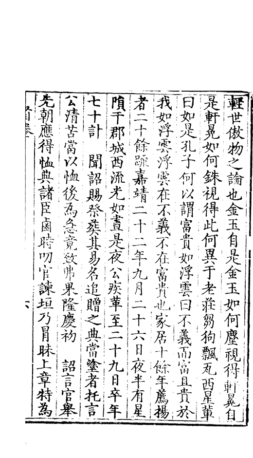 輕世傲物之論也金玉自是金玉如何塵視得軒冕自是軒冕如何銖視得此何異于老莊芻狗飄□西星軰曰如是孔子何以謂富貴如浮雲曰不義而富且貴於我如浮雲浮雲在不義不在富貴也家居十餘□薦揚者二十餘□嘉靖二十二年九月二十六日夜半有星□于郡城西流光如晝是夜公疾革至二十九日卒□七十訃 聞詔賜□□其易名追贈之典當塗者托言公清苦當以恤後為急竟致弗果隆慶□ 詔言官舉先朝應得恤典諸臣鹵時叨官諫垣乃冐昧上章特為