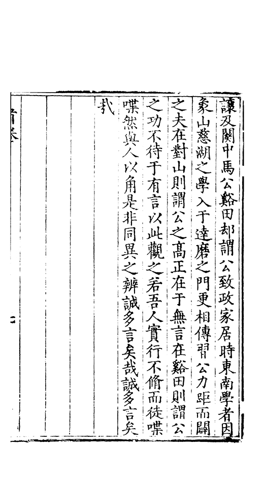 讓及闋中馬公谿田却謂公致政家居時東南學者因象山慈湖之學入于達磨之門更相傳□公力距而闢之夫在對山則謂公之□正在于無言在谿田則謂公之功不待于有言以 觀之□吾人實行不脩而徒喋喋然與人以角是非同異之辨誠多言矣哉誠多言矣哉