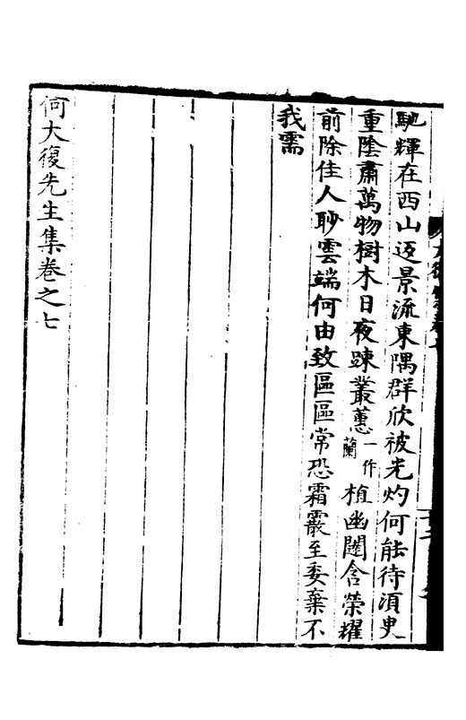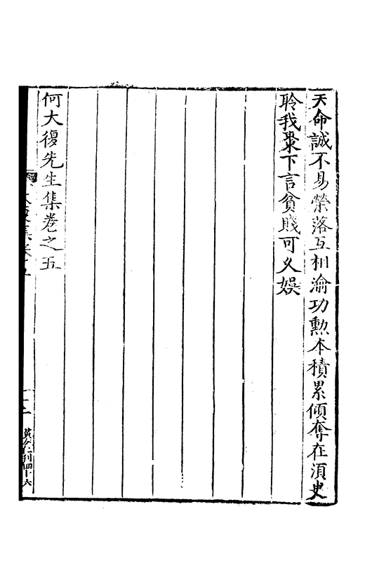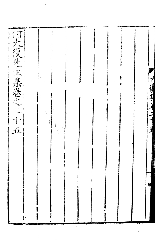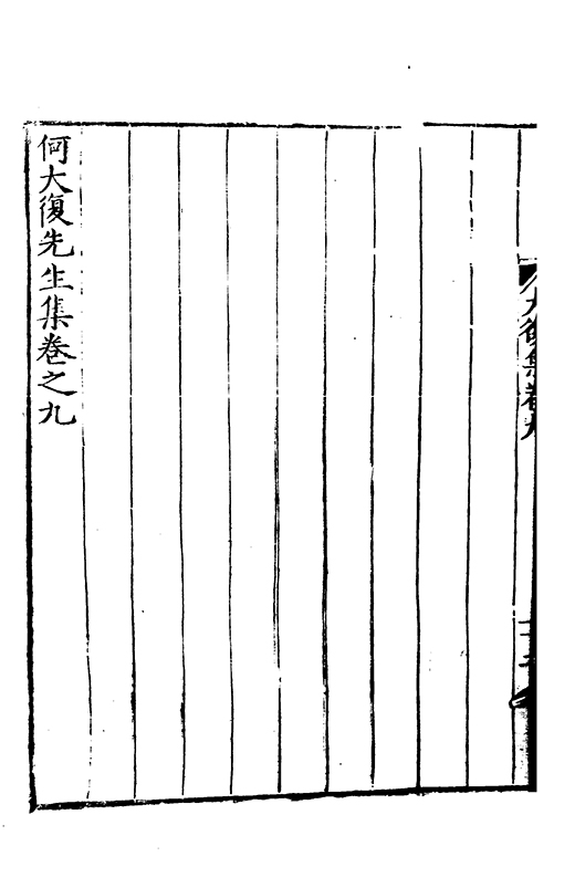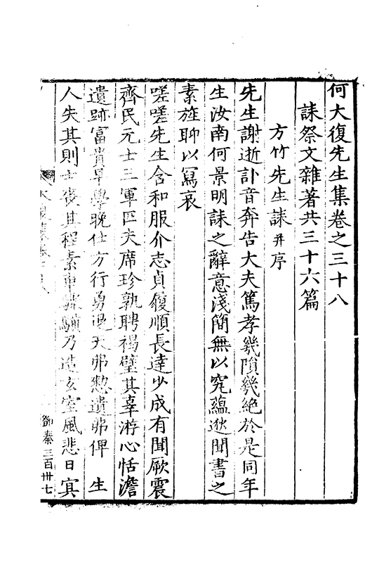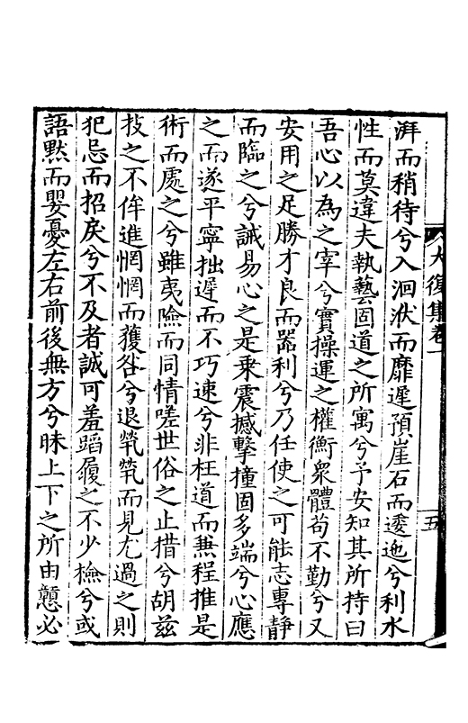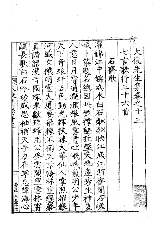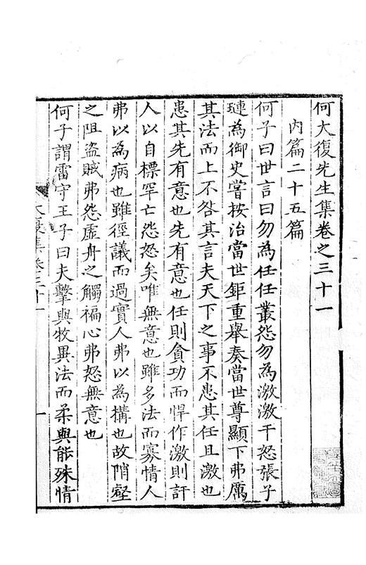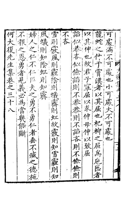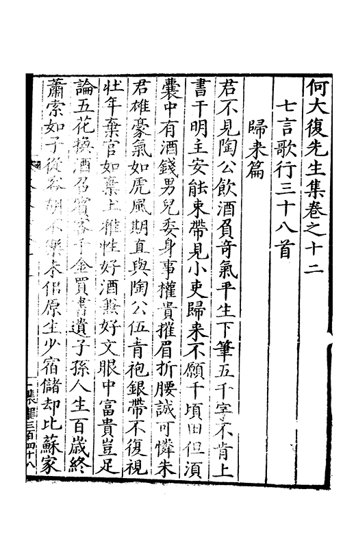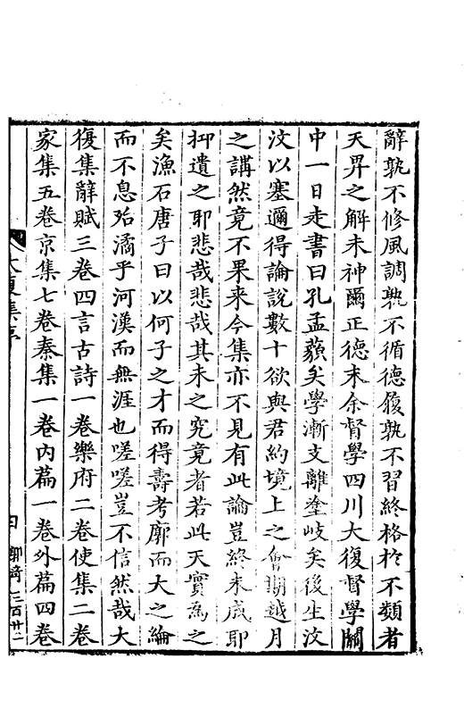 辭孰不修風調孰不循德履孰不習終格扵不類者天畀之解未神爾正德末余督學四川大復督學關中一日走書曰孔孟藐矣學漸支離塗岐矣後生汶汶以塞邇得論説數十欲與君約境上之會期越月之講然竟不果來今集亦不見有此論豈終未成耶抑遺之耶悲哉悲哉其未之究竟者若此天實為之矣漁石唐子曰以何子之才而得壽考廓而大之綸而不息殆潏乎河漢而無涯也嗟嗟豈不信然哉大復集辭賦三卷四言古詩一卷樂府二卷使集二卷家集五卷京集七卷秦集一卷内篇一卷外篇四卷