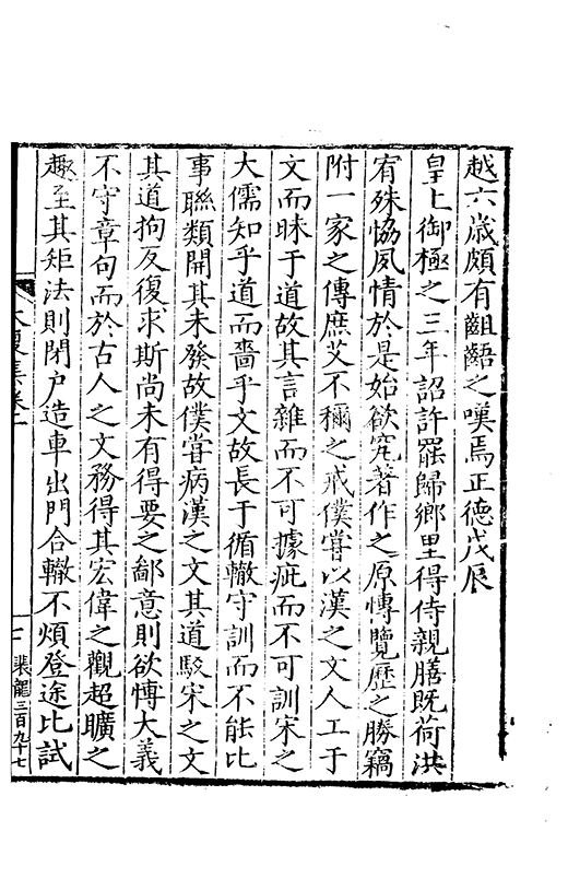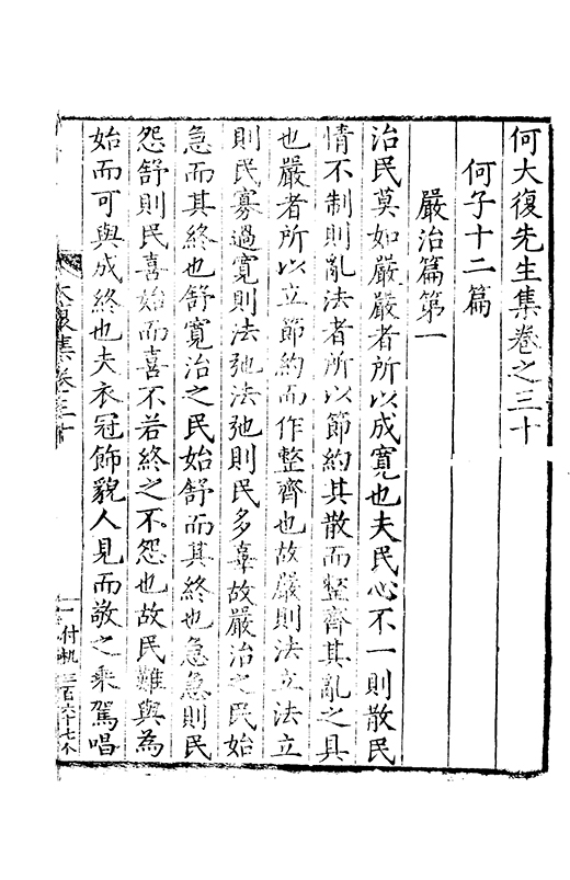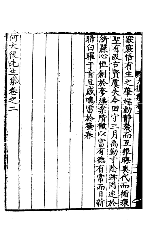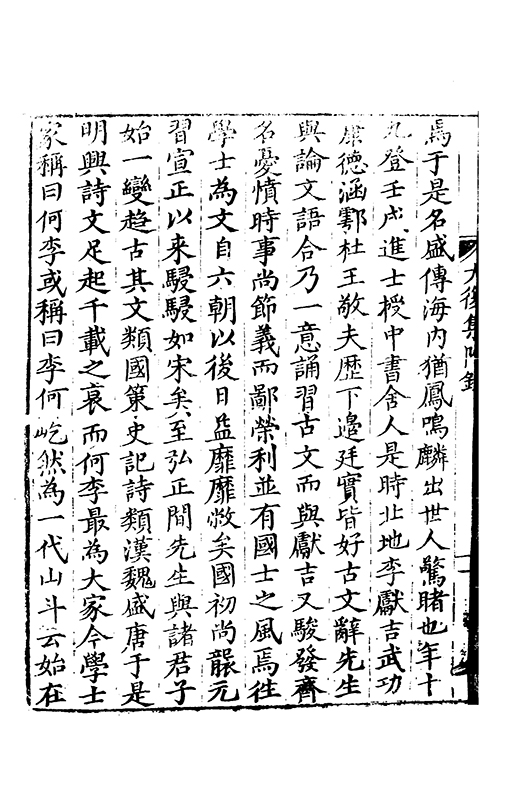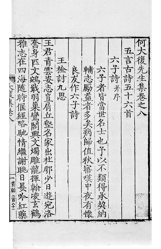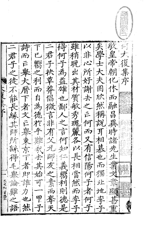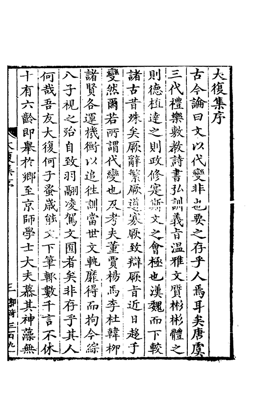 古今論曰文以代變非也要之存乎人焉耳矣唐虞三代禮樂敷教詩書弘訓義旨温雅文質彬彬體之則德植達之則政修寔斯文之會極也漢魏而下較諸古昔殊矣厥辭繁厥道寡厥致辯厥旨近日趍于變然爾若所謂代變也及考夫董賈楊馬李杜韓栁諸賢各運機衡以追徃訓當世文軌靡得而拘今綜八子視之殆自致羽翮凌駕文囿者矣非存乎其人何哉吾友大復何子蚤嵗能文下筆輙數千言不休十有六齡即舉扵郷至京師學士大夫慕其神藻無