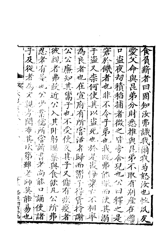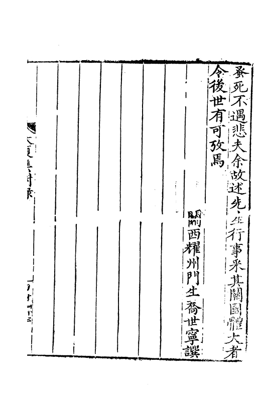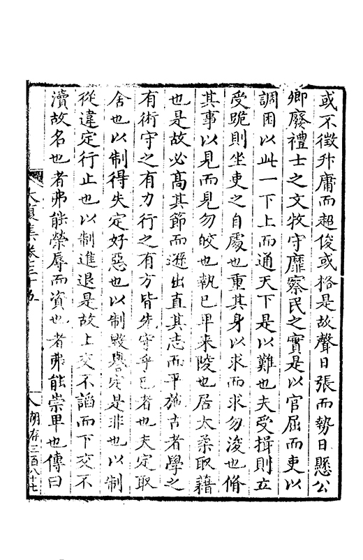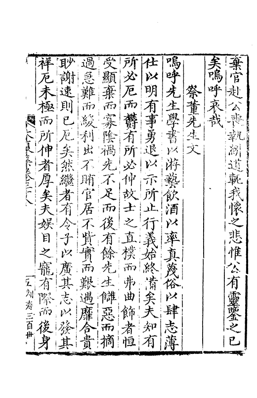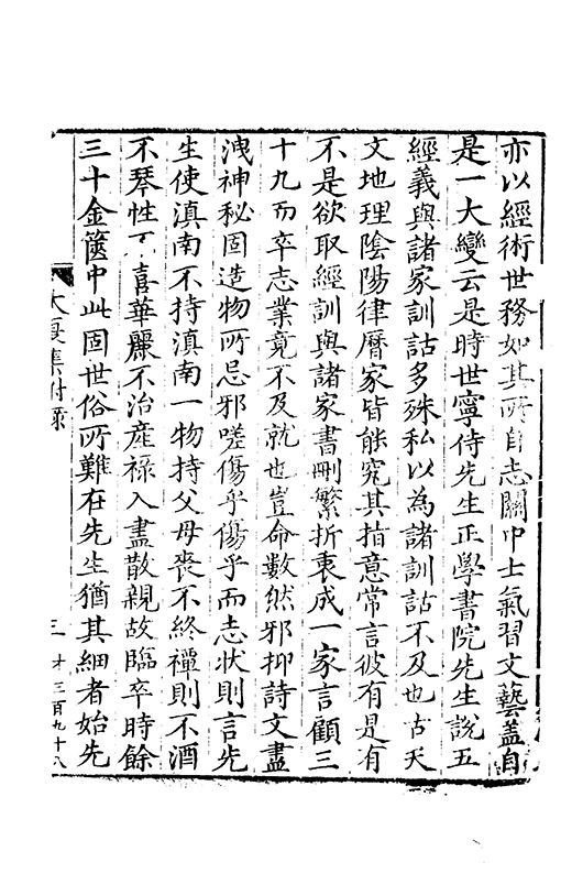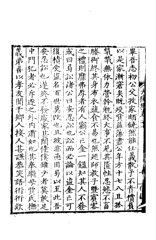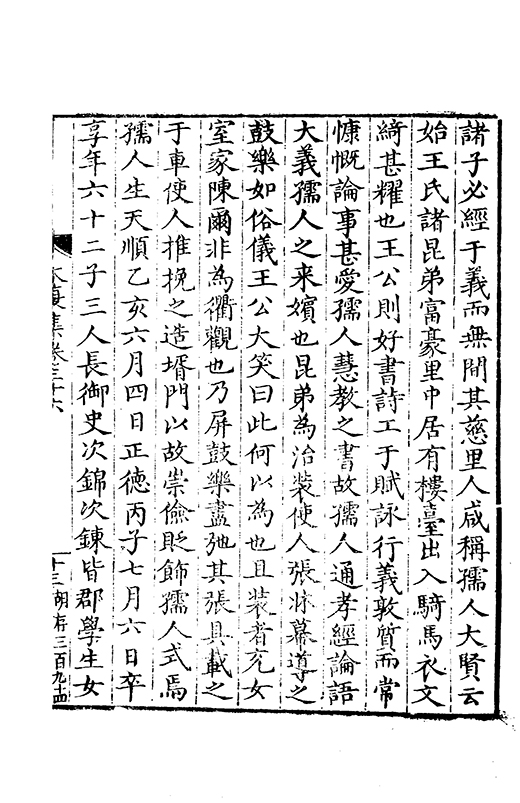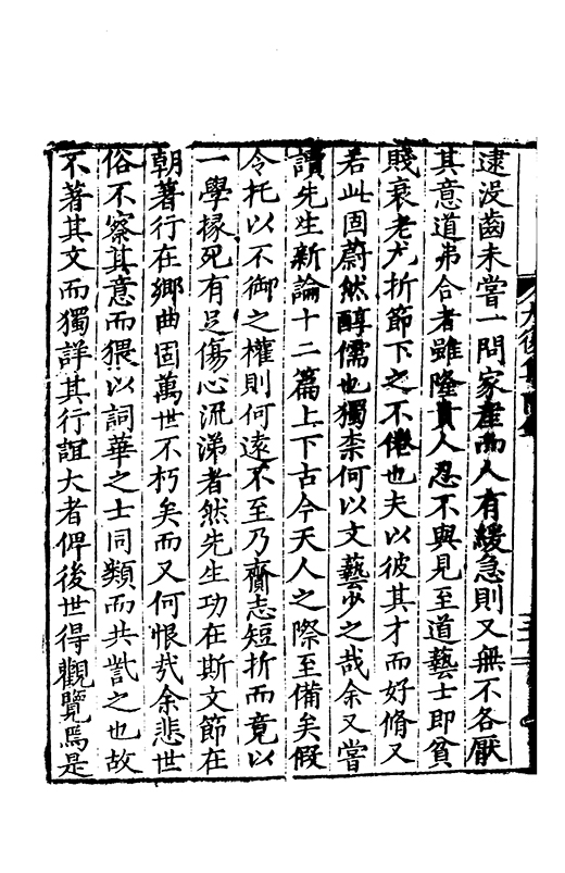 逮没齒未嘗一問家産而人有緩急則又無不各厭其意道弗合者雖隆貴人忍不與見至道藝士即貧賤衰老尤折節下之不倦也夫以彼其才而好脩又若此固蔚然醇儒也獨柰何以文藝少之哉余又嘗讀先生新論十二篇上下古今天人之際至備矣假令托以不御之權則何逺不至乃齎志短折而竟以一學掾死有足傷心流涕者然先生功在斯文節在朝著行在鄊曲固萬世不朽矣而又何恨哉余悲世俗不察其意而猥以詞華之士同類而共訾之也故不著其文而獨詳其行誼大者俾後世得觀覽焉是