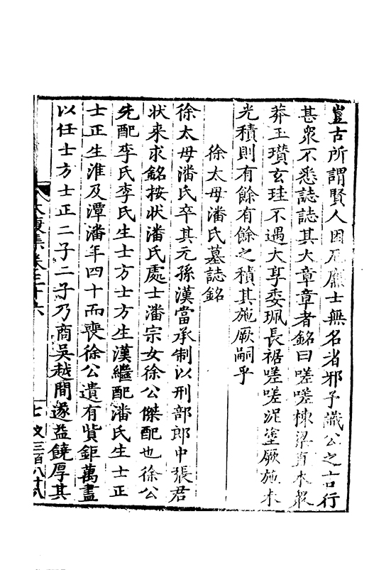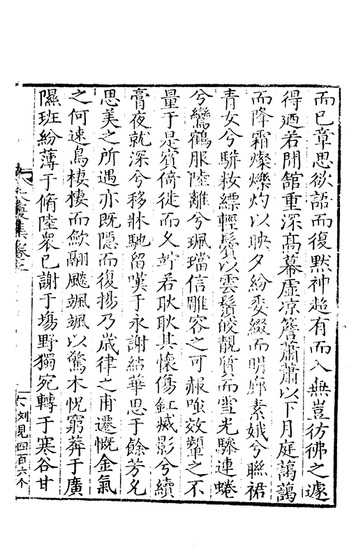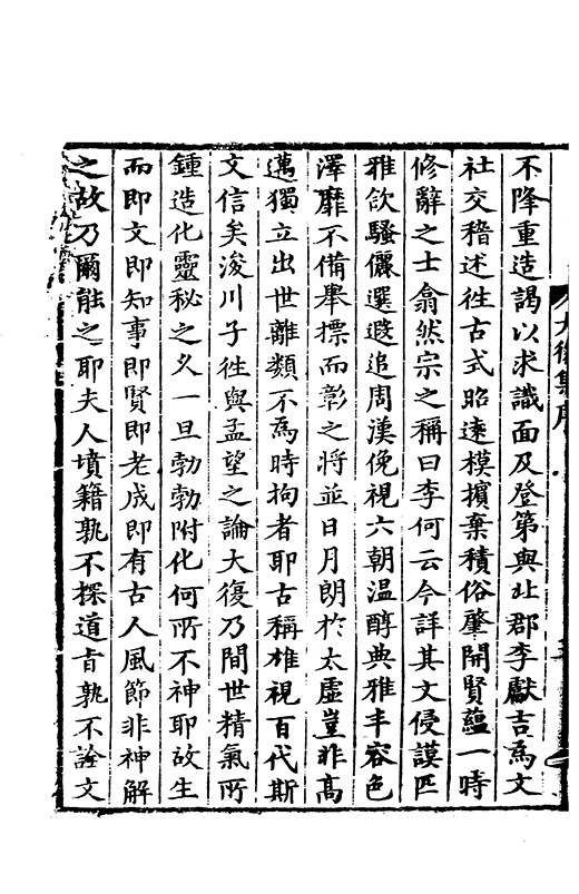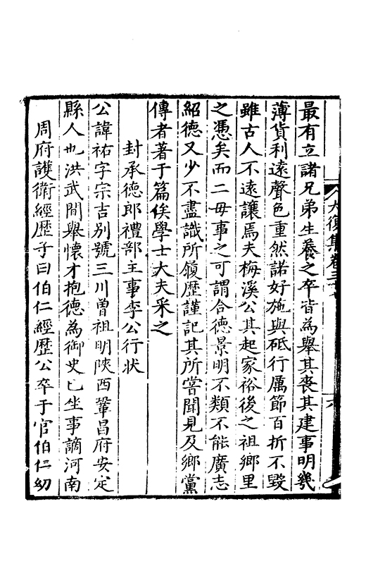 不降重造謁以求識面及登第與北郡李獻吉為文社交稽述徃古式昭逺模擯棄積俗肇開賢藴一時修辭之士翕然宗之稱曰李何云今詳其文侵謨匹雅欱騷儷選遐追周漢俛視六朝温醇典雅丰容色澤靡不備舉標而彰之将並日月朗扵太虛豈非高邁獨立出世離類不為時拘者耶古稱雄視百代斯文信矣浚川子徃與孟望之論大復乃間世精氣所鍾造化靈秘之乆一旦勃勃附化何所不神耶故生而即文即知事即賢即老成即有古人風節非神解之故乃爾能之耶夫人墳籍孰不探道旨孰不詮文