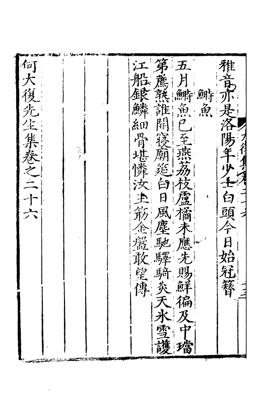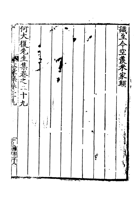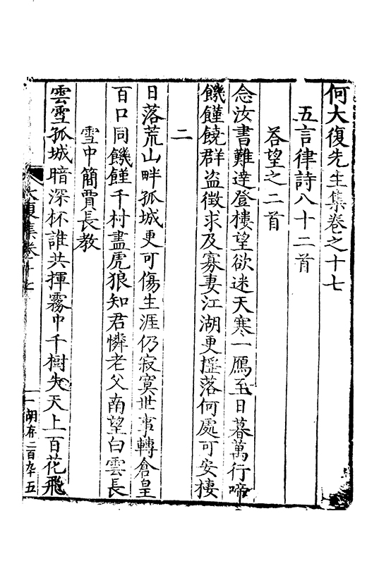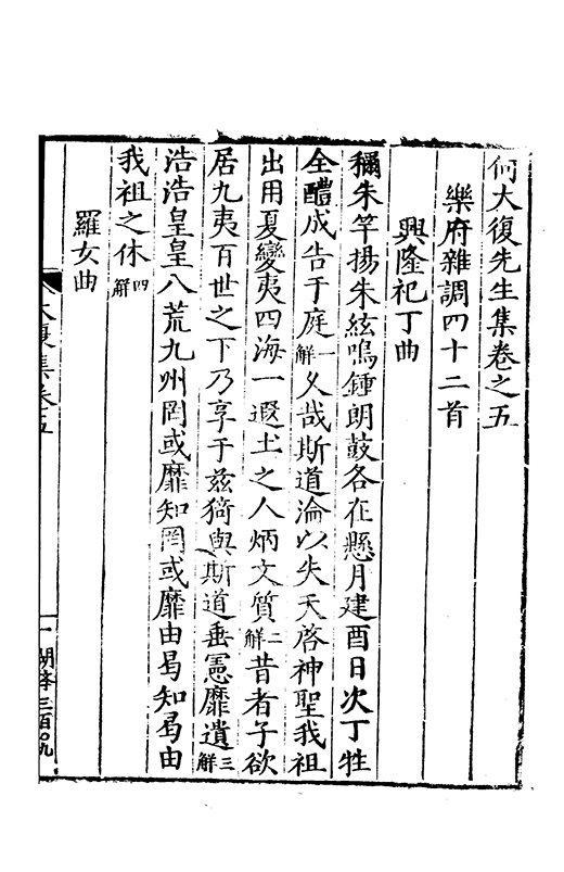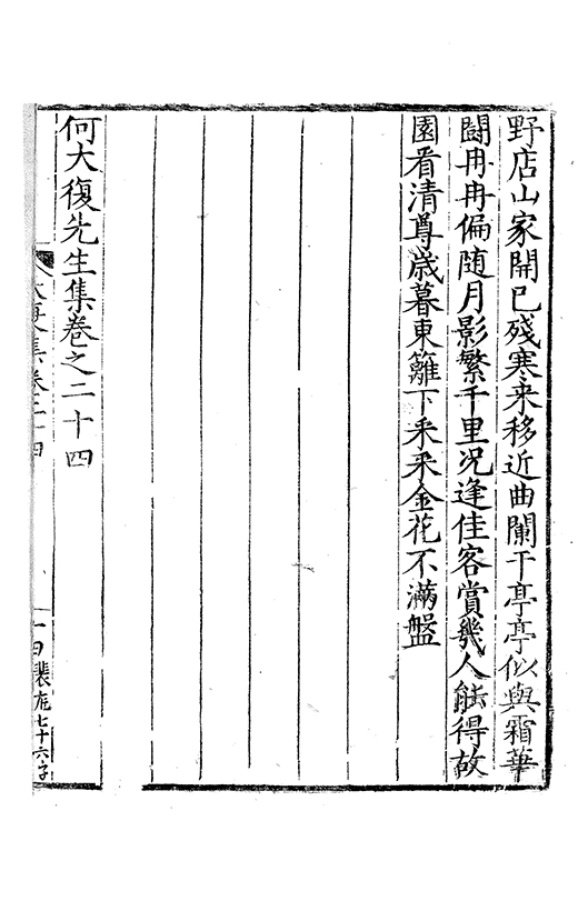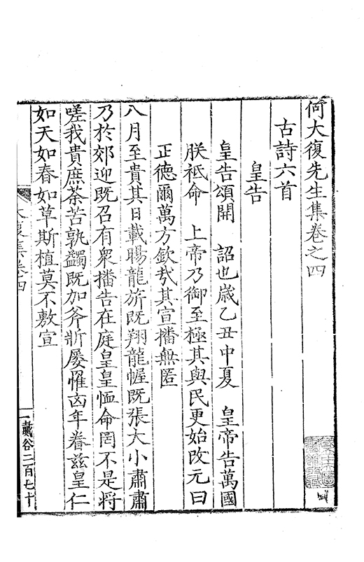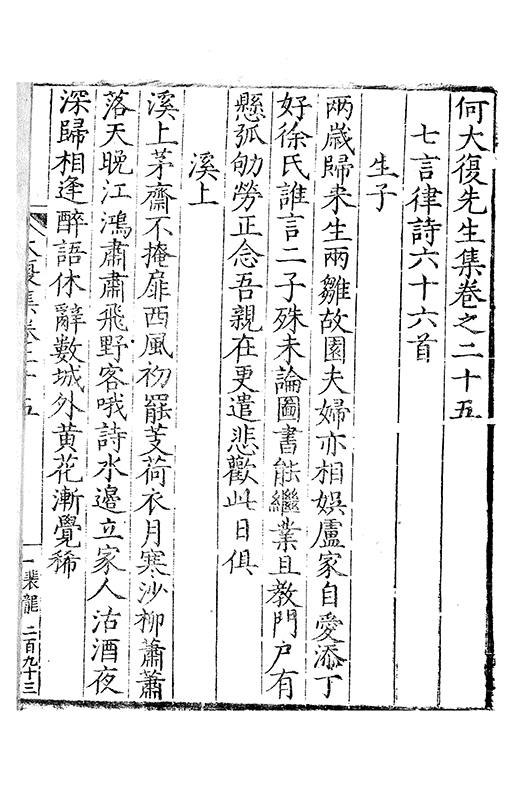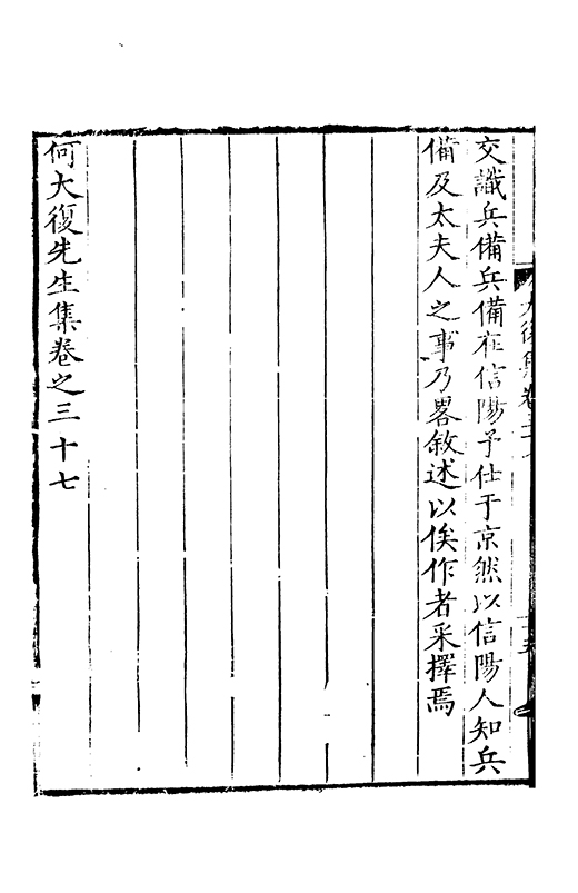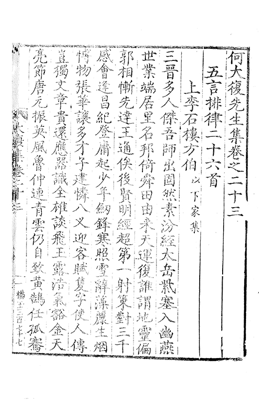當世以作者名家必首何李何則學士所稱大復先生何仲黙云徃聞先生将終屬諸弟子必李獻吉銘吾墓諸弟子不果聚族而私為状為志為銘其後數十年門人喬景叔始為何先生傳概舉其質行著者載傳中又數十年先生有孫洛文守太子中允将修闕事屬余為先生碑余從諸後死者尸祝先生顧得逮事為幸即無能為中允役其何敢辭先生家信陽世有秋堇堇母李夣赤日而娠及舉而命之曰景明