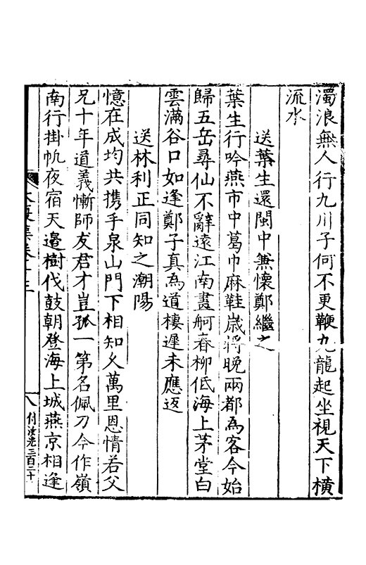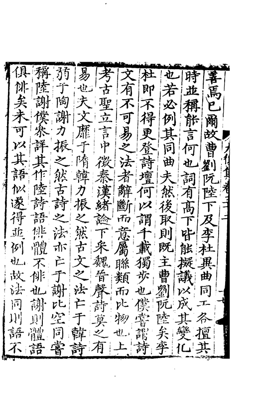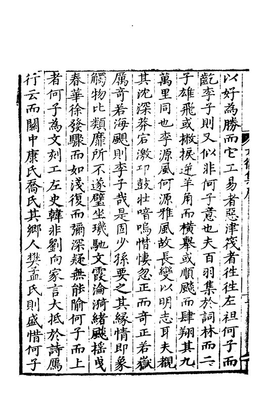 以好為勝而它工易者惡津筏者徃徃左袒何子而齕李子則又似非何子意也夫百羽集於詞林而二子雄飛或撇捩逆羊角而横舉或順颷而肆翔其九萬里同也李源風何源雅風故長變以明志耳夫覩其沈深莽宕激卭鼓壮喑鳴憯悽忽正而竒正若嶽厲竒若海颶則李子哉是固少孫要之其縁情即象觸物比類靡所不遂璧坐璣馳文霞淪漪緒颷摇曵春華徐發驟而如淺復而彌深疑無能隃何子而上者何子為文刻工左史韓非劉向家言大抵於詩鴈行云而關中康氏喬氏其郷人樊孟氏則盛惜何子