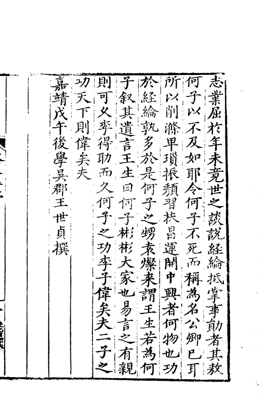 志業屈扵年未竟世之談說経綸抵掌事勛者其敖何子以不及如耶令何子不死而稱為名公卿已耳所以削滌卑瑣振頺習扶昌運開中興者何物也功於経綸孰多於是何子之甥袁燦來謂王生若為何子叙其遺言王生曰何子彬彬大家也易言之有親則可乆李得助而久何子之功李子偉矣夫二子之功天下則偉矣夫
