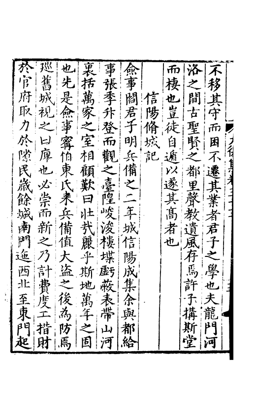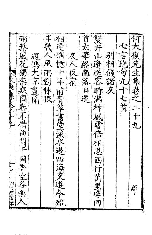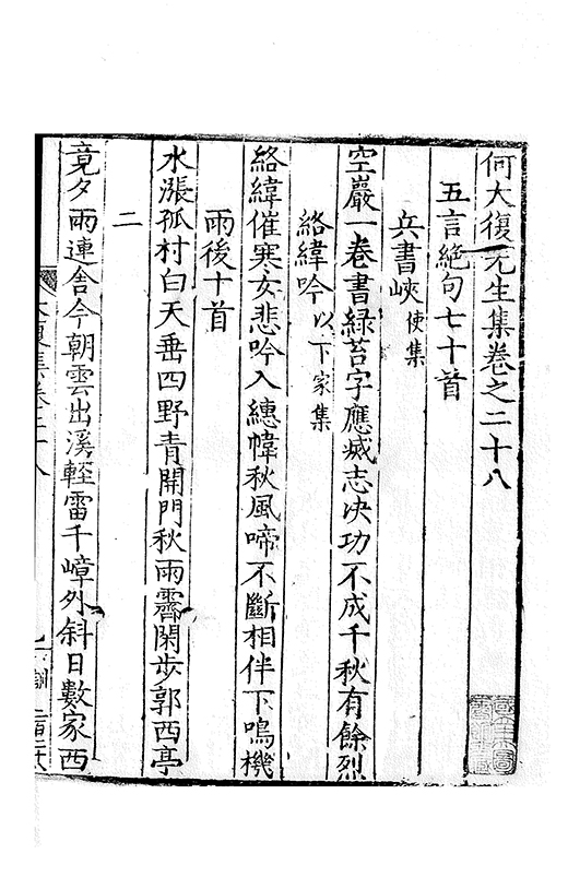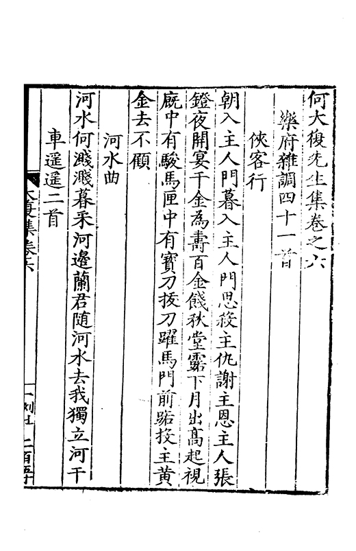 何景明字仲黙信陽人生有異質弘治中舉進士授中書舍人崇古學抑陋習文體為之一變正徳初逆瑾用事景明謝病歸瑾敗復職直内閣制勑房會乾清宫災應 詔陳時政語頗激切不報乆之補副使督學關中會疾作棄官歸卒年三十九所著有雍大記三十卷何氏集二十六卷行於世