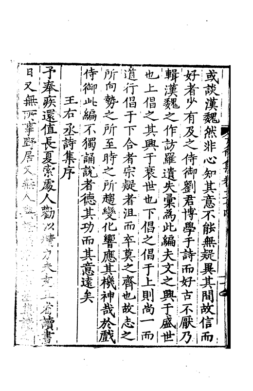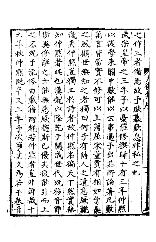 武宗皇帝之三年予以憂罷修撰歸十有三年仲黙以提學來關中數能以公事過予出其所論著凡數萬言皆當實不修可以上薄屈宋董賈有相如子長之風顧世無知之者獨曰何子有詩人之遺意厥覿淺矣仲黙豈獨工扵詩者故仲黙名徧天下然實無知仲黙者此也漢魏以降訖于開成世代既移音節斯異修辭之士能無惡厥趨斯已優矣復能引而上之不沉于流俗由載籍所覩若仲黙者豈非鮮哉十六年秋仲黙既卒又三年予次第其文為若干卷首