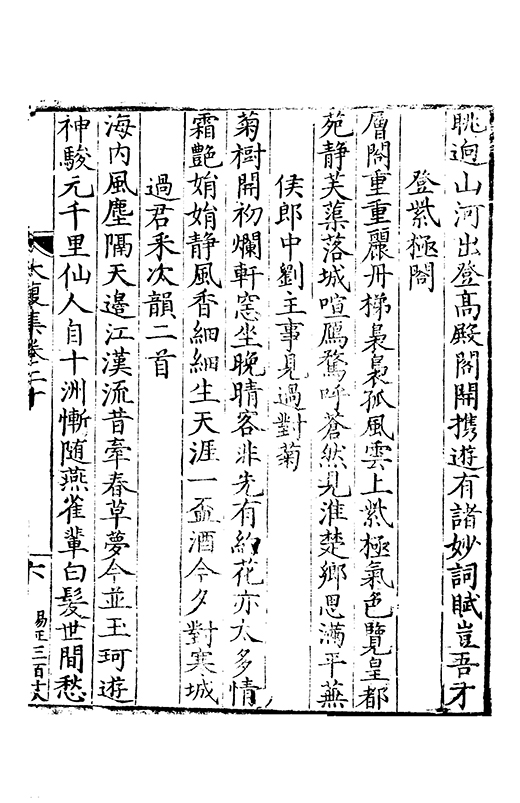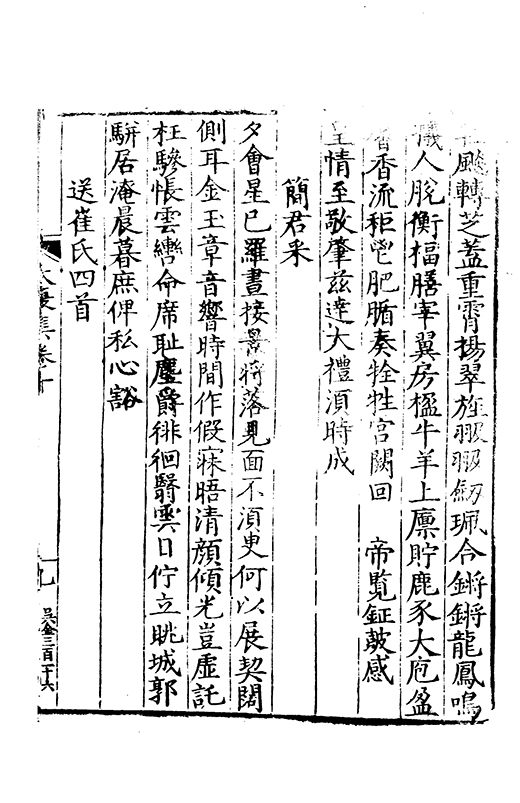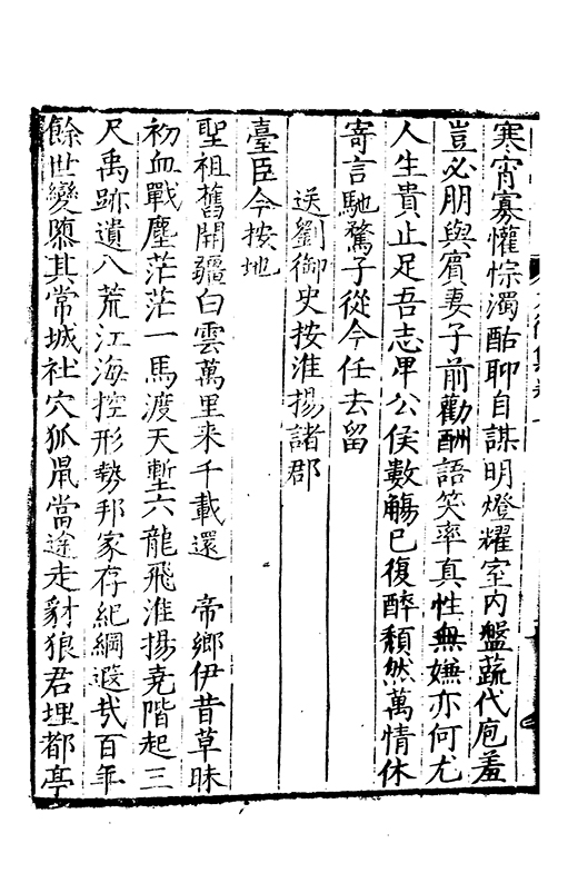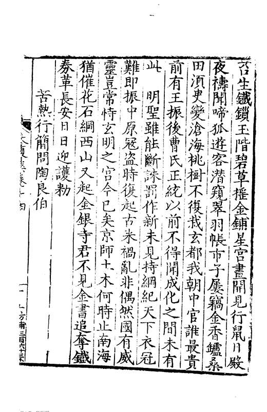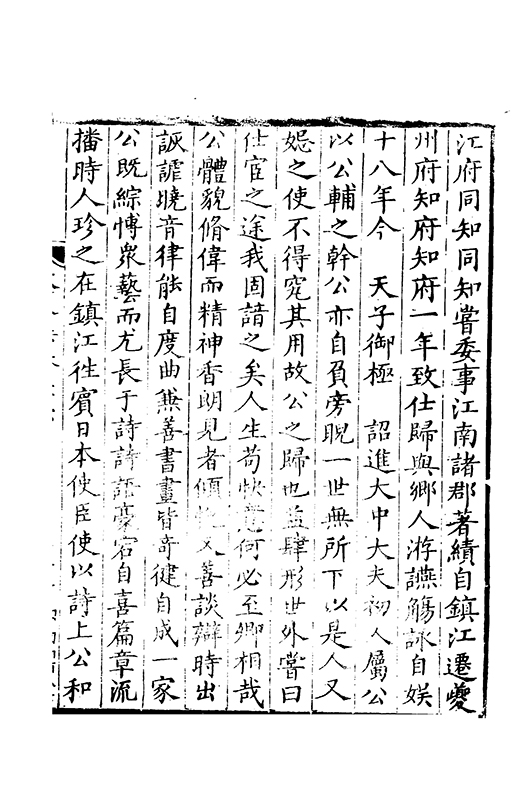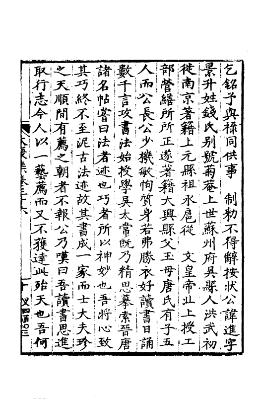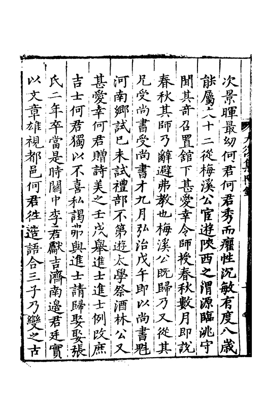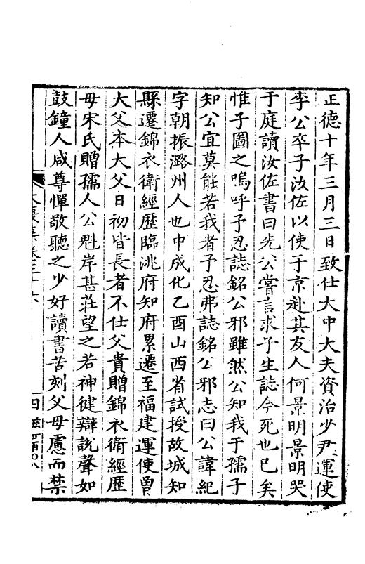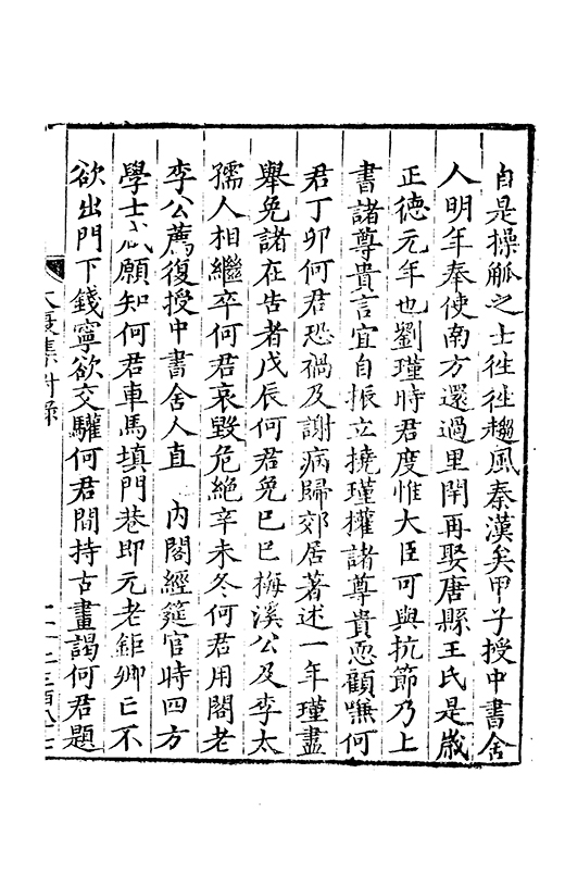 自是操觚之士徃徃趨風秦漢矣甲子授中書舍人明年奉使南方還過里閈再娶唐縣王氏是嵗正徳元年也劉瑾時君度惟大臣可與抗節乃上書諸尊貴言宜自振立撓瑾權諸尊貴恧顧嗛何君丁卯何君恐禍及謝病歸郊居著述一年瑾盡舉免諸在告者戊辰何君免已已梅溪公及李太孺人相繼卒何君哀毁危絶辛未冬何君用閣老李公薦復授中書舍人直 内閣經筵官時四方學士咸願知何君車馬填門巷即元老鉅卿亡不欲出門下錢寜欲交驩何君間持古畫謁何君題