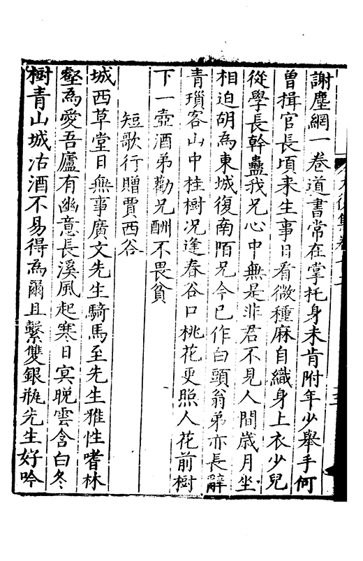 敬皇帝哀詔下雲南逺方君長及中貴人咸贈遺犀象珎貝謝弗受後逆瑾用事上書諸大臣言宜自振立以抑瑾權不用謝病歸踰年免官瑾敗大學士李東陽薦復授中書舍人直内閣制勑房 經筵官其友李夢陽遭江西之訟衆多媒蘖其短莫肯為直者