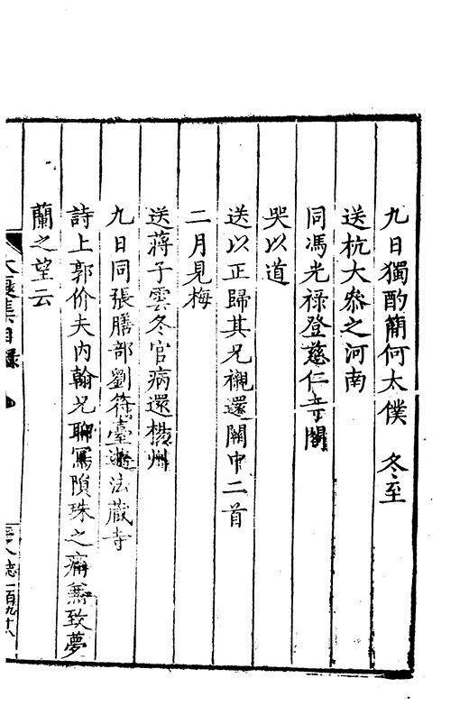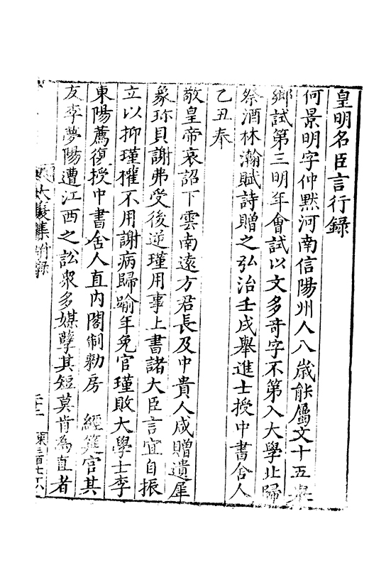 何景明字仲黙河南信陽州人八嵗能属文十五舉郷試第三明年會試以文多竒字不第入大學北歸祭酒林瀚賦詩贈之弘治壬戌舉進士授中書舍人乙丑奉
