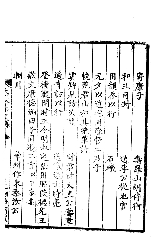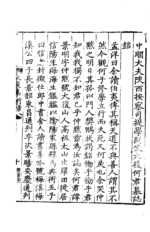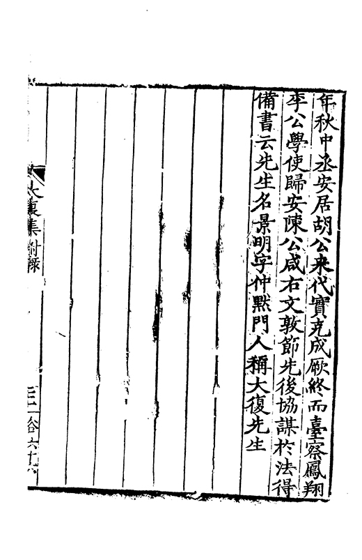 年秋中丞安居胡公來代實克成厥終而臺察鳳翔李公學使歸安陳公咸右文敦節先後協謀扵法得備書云先生名景明字仲黙門人稱大復先生