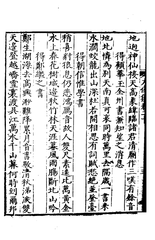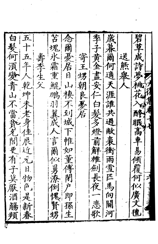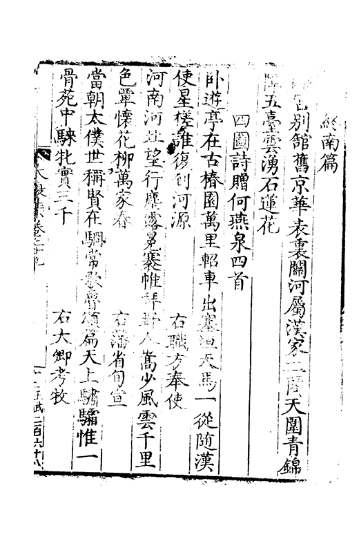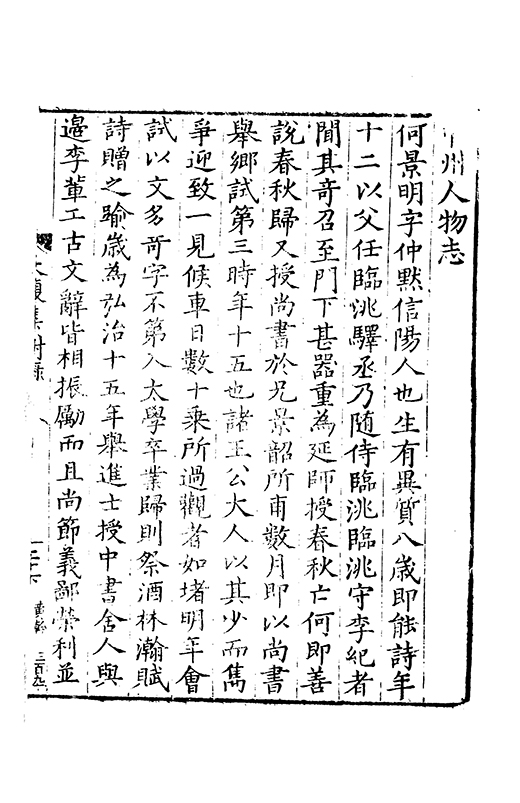 何景明字仲黙信陽人也生有異質八嵗即能詩年十二以父任臨洮驛丞乃随侍臨洮臨洮守李紀者聞其竒召至門下甚器重為延師授春秋亡何即善說春秋歸又受尚書於兄景韶所甫數月即以尚書舉郷試第三時年十五也諸王公大人以其少而雋爭迎致一見候車日數十乗所過觀者如堵明年會試以文多竒字不第入太學卒業歸則祭酒林瀚賦詩贈之踰嵗為弘治十五年舉進士授中書舍人與邉李軰工古文辭皆相振勵而且尚節義鄙榮利並