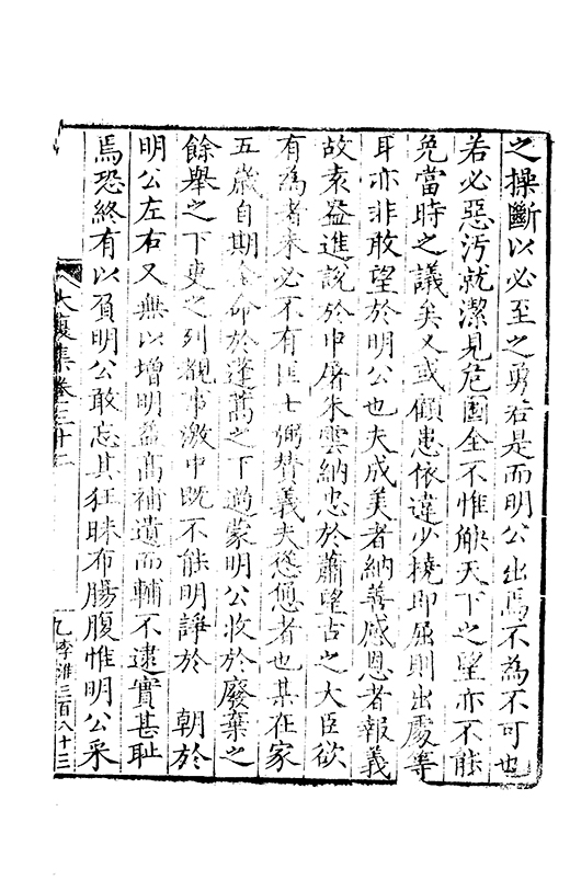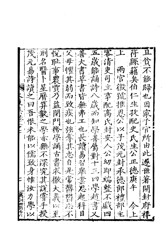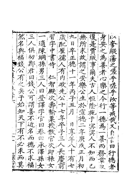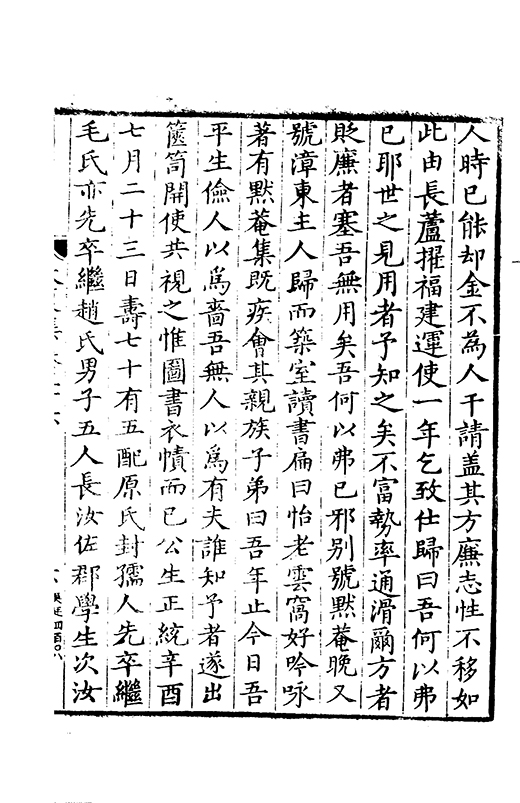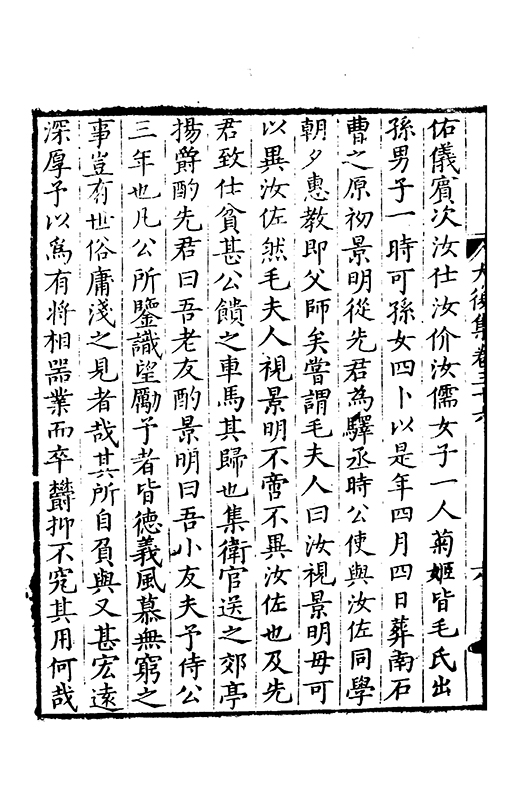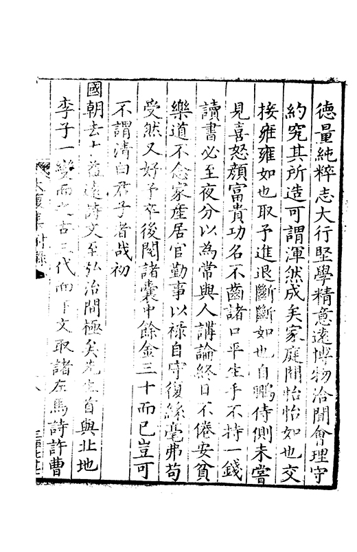 徳量純粹志大行堅學精意逺博物洽聞會理守約究其所造可謂渾然成矣家庭間怡怡如也交接雍雍如也取與進退斷斷如也自鵬侍側未嘗見喜怒顔富貴功名不齒諸口平生手不持一錢讀書必至夜分以為常與人講論終日不倦安貧樂道不念家産居官勤事以禄自守復絲毫弗茍受然又好予卒後閱諸囊中餘金三十而已豈可不謂清白君子者哉初
