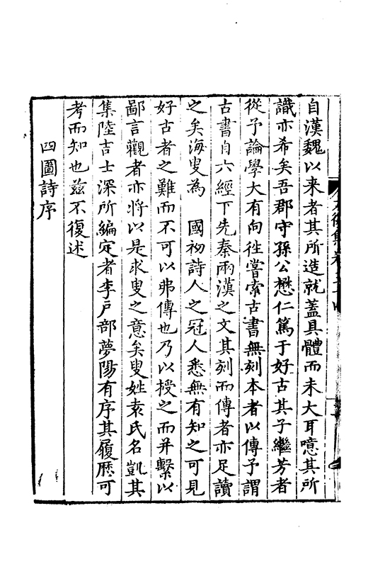 弘治初北地李夢陽首為古文以變宋元之習文稱左遷賦尚屈宋詩古體宗漢魏近律法李杜學士大夫翕焉從之其時濟南邉貢姑蘇徐禎卿及景明最有名世稱四傑四人才各有所長李天才雄徤徐陶冶精融而景明藻思秀逸皆藝苑之鴻匠也