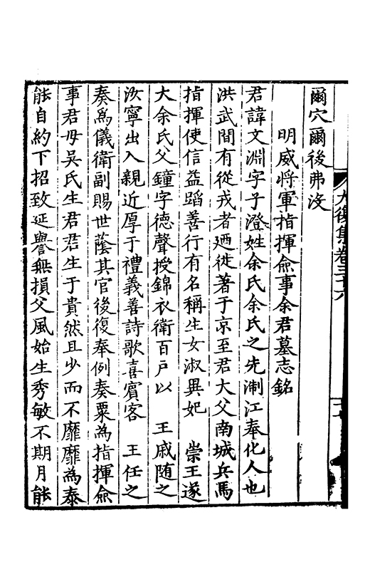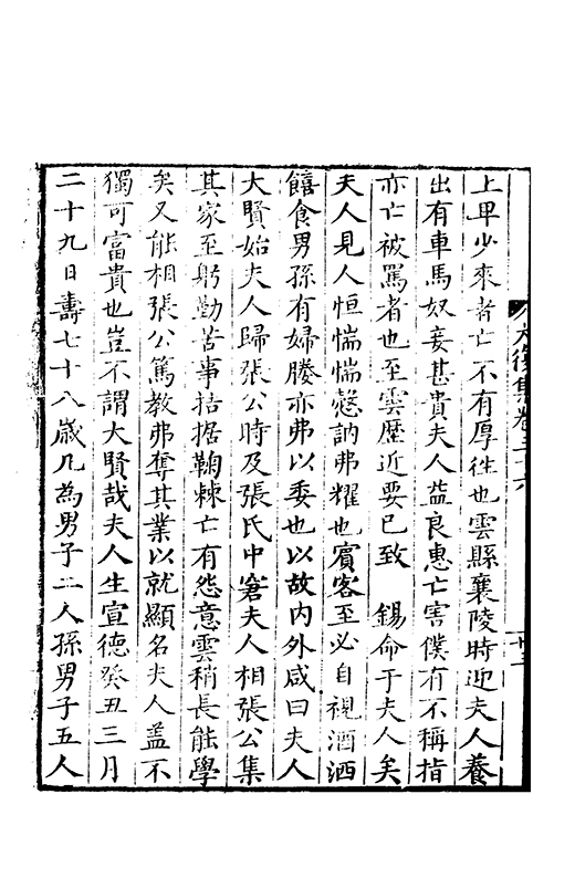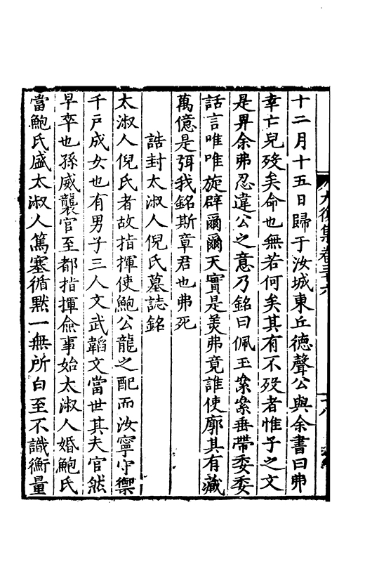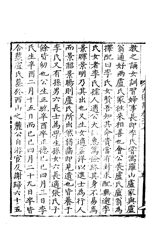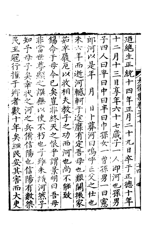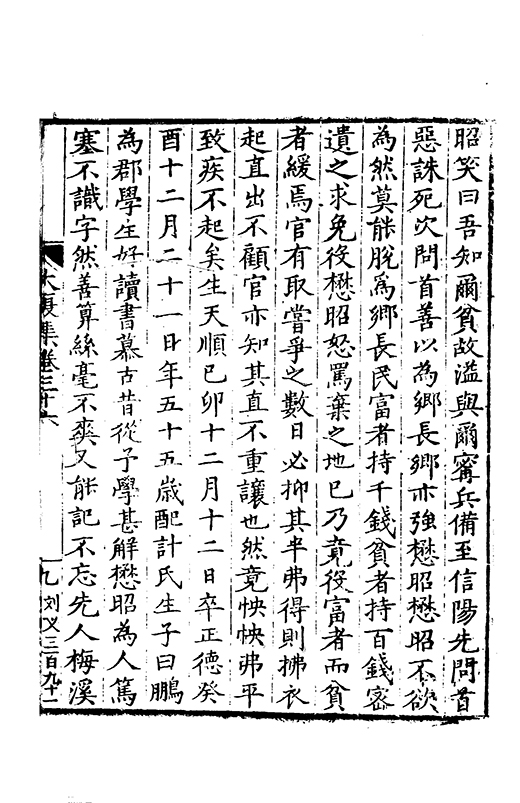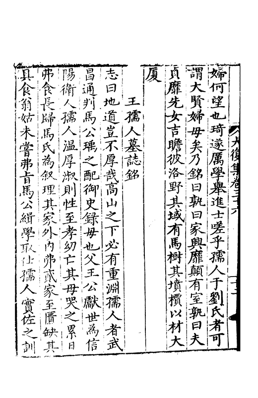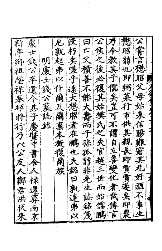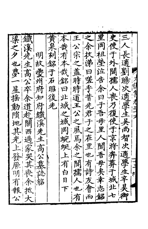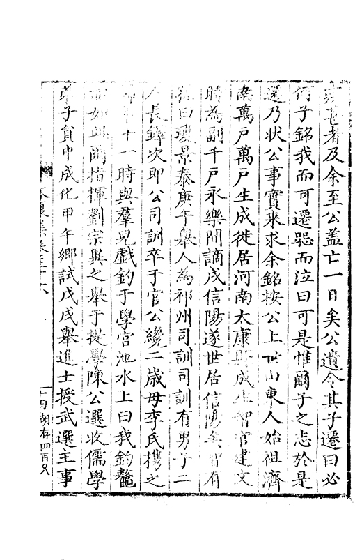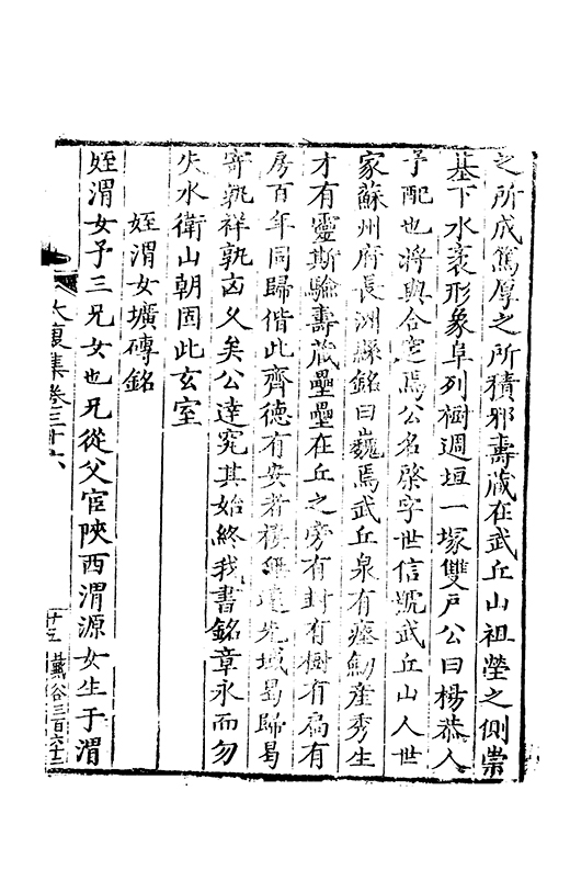 結懽士大夫君曰奚為汙吾友地下乃出金賻之諸所知皆賻之歛成禮旋卻所賻棺其見義勇為如此何君天資頴異好學常若不及讀書率過夜半即盛暑蟁蝱汗洽背不廢邇年略去詞章嘗稱以為天下自有實用之學竭精力猶弗逮何暇文詞無益也盖其用世之志至逺今中沮矣惜哉及王孺人以哀絶亡他顧慮亦貞固矣何君生成化癸卯八月丙寅卒年三十九嵗王孺人少二嵗生成化乙巳二月甲寅子三人長聘郟縣王氏叅政君女次立次登女三人長聘袁氏子次馮氏子次