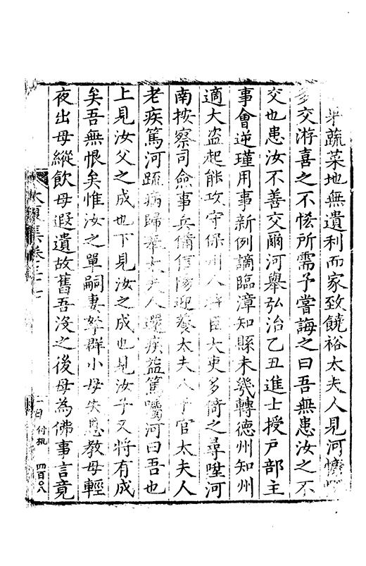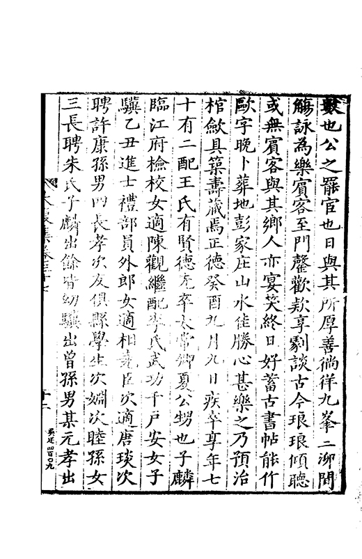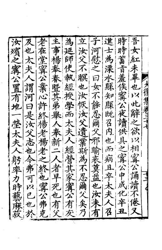 君謝曰此名畫不可點毁弗許乾清宫災君應詔言時事詞義剴切疏留不下丁丑陞吏部驗封司員外郎仍直 内閣戊寅陞陜西按察司提學副使提學政尚嚴務在崇本起弊士初稍不堪漸乆而安風習亦振初何君獨以文學著聞既提學人又服其能政若是辛已二月何君以形勞慮深卒然嘔血損六月棄官歸會道暑益亟抵家六日為八月五日而何君卒嗚呼傷哉王孺人故有内疢號痛莫支越十六日亦暴蹷而卒孺人幼喪父相者貴之人求婚母輒不許年二十二始歸何君以