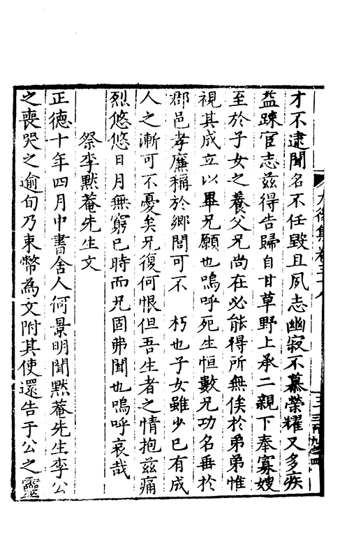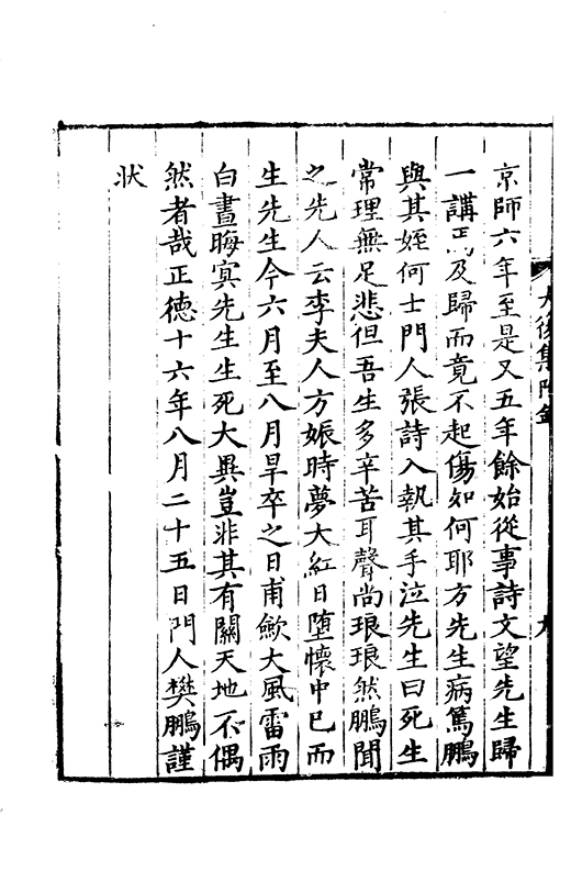 京師六年至是又五年餘始從事詩文望先生歸一講焉及歸而竟不起傷如何耶方先生病篤鵬與其姪何士門人張詩入執其手泣先生曰死生常理無足悲但吾生多辛苦耳聲尚琅琅然鵬聞之先人云李夫人方娠時夢大紅日堕懷中巳而生先生今六月至八月旱卒之日甫歛大風雷雨白晝晦冥先生生死大異豈非其有關天地不偶然者哉正徳十六年八月二十五日門人樊鵬謹状