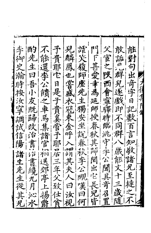 能對句出竒字日記數百言知敬諸兄至撻之不敢詬見群兒逐戲即不同群八嵗能文十二嵗随父宦之陜西會寜驛時臨洮守李公聞其竒召置門下甚愛幸為延師授春秋其師間出它長兒皆謔笑履師座先生獨安坐說春秋李公覵嘆曰何兒麟鳳也嘗盛衣冠束金呼入謂其夫人曰汝視予貴邪它日是子貴奚啻予耶居三年父致仕貧不能還李公饋之車馬集諸官相送郊亭上揚爵酌先生曰吾小友既歸攺治書治書纔九月沁水李御史瀚時按汝寜調試信陽諸生先生從其兄