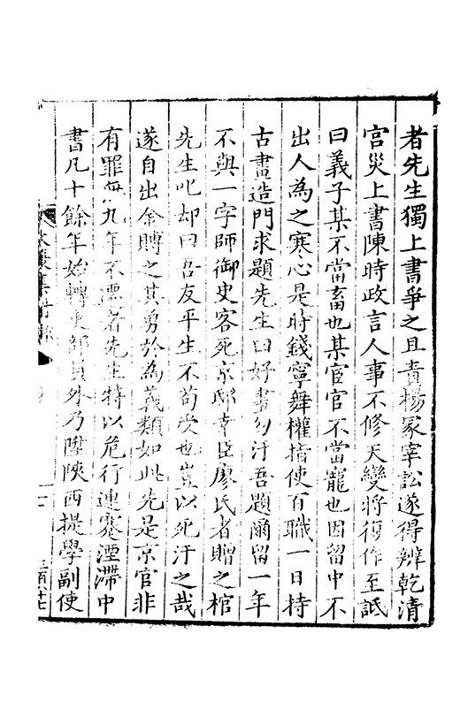 者先生獨上書爭之且責楊冢宰訟遂得辨乾清宫災上書陳時政言人事不修天變将復作至詆曰義子某不當畜也某宦官不當寵也因留中不出人為之寒心是時錢寜舞權指使百職一日持古畫造門求題先生曰好畫勿汙吾題爾留一年不與一字師御史客死京邸幸臣廖氏者贈之棺先生叱却曰吾友平生不茍受也豈以死汙之哉遂自出金賻之其勇於為義類如此先是京官非有罪無九年不遷者先生特以危行連蹇湮滯中書凡十餘年始轉吏部員外乃陞陜西提學副使