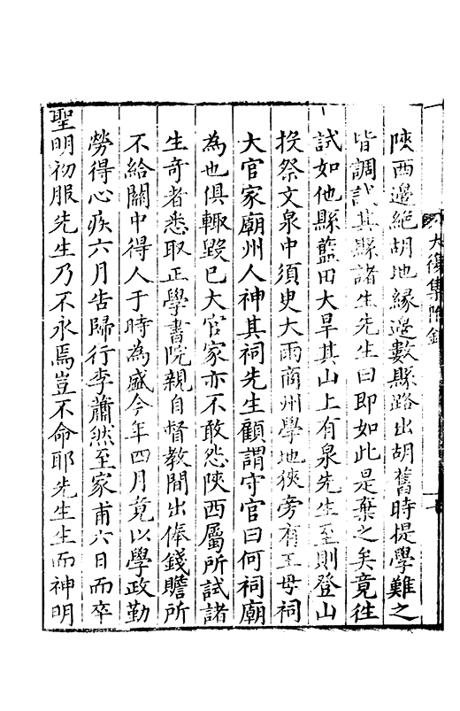 陜西邉絶外地縁邉數縣路出外舊時提學難之皆調試其縣諸生先生曰即如此是棄之矣竟徃試如他縣藍田大旱其山上有泉先生至則登山投祭文泉中須臾大雨商州學地狹旁有王母祠大官家廟州人神其祠先生顧謂守官曰何祠廟為也俱輙毁已大官家亦不敢怨陜西屬所試諸生竒者悉取正學書院親自督敎間出俸錢贍所不給關中得人于時為盛今年四月竟以學政勤勞得心疾六月告歸行李蕭然至家甫六日而卒