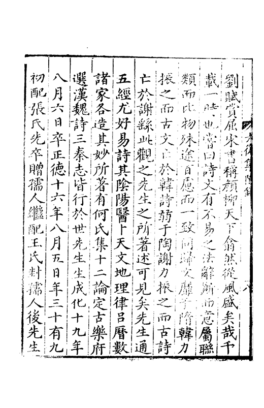 劉賦賞屈宋書稱顔柳天下翕然從風盛矣哉千載一時也嘗曰詩文有不易之法辭斷而意屬聮類而比物殊途百慮而一致同歸文靡于隋韓力振之而古文亡於韓詩弱于陶謝力振之而古詩亡於謝繇此觀之先生之所著述可見矣先生通五經尤好易詩其隂陽醫卜天文地理律吕曆數諸家各造其妙所著有何氏集十二論定古樂府選漢魏詩三秦志皆行於世先生生成化十九年八月六日卒正徳十六年八月五日年三十有九初配張氏先卒贈孺人繼配王氏封孺人後先生